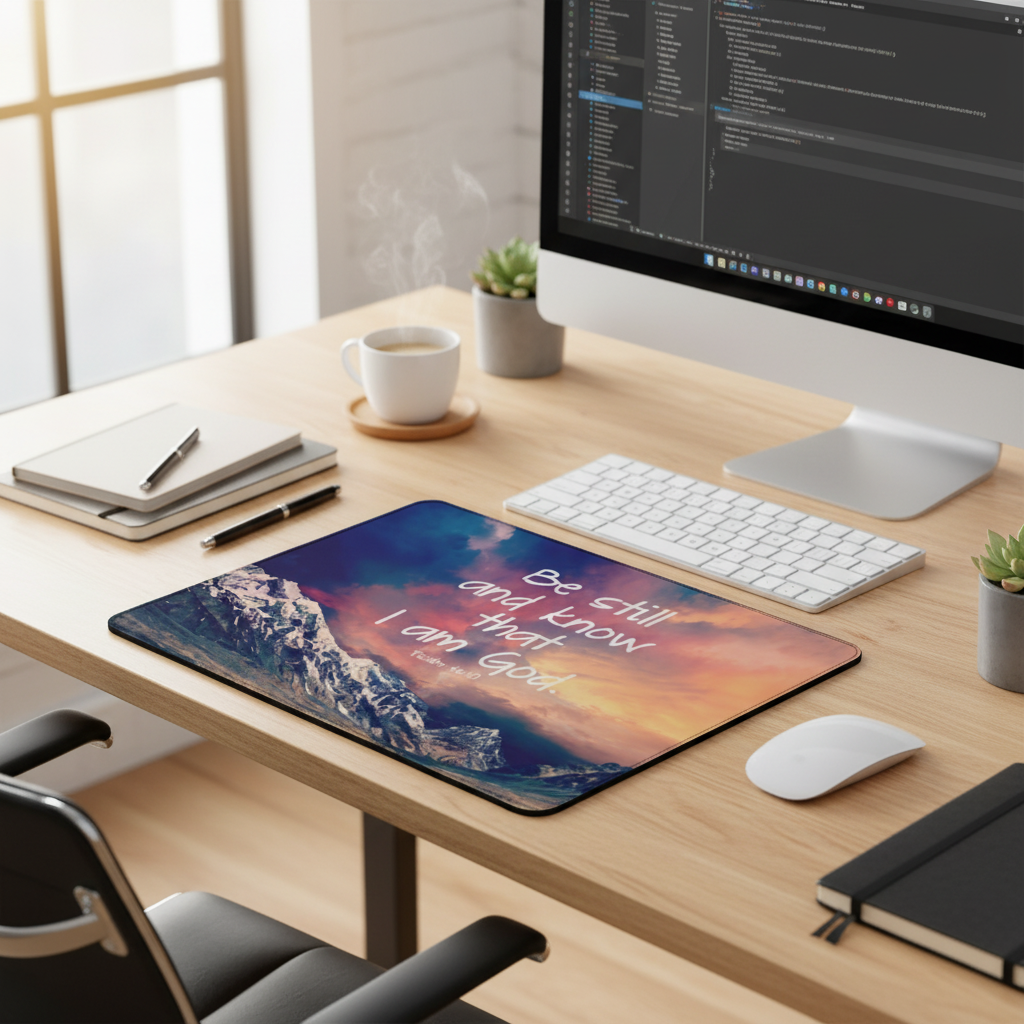 Be Still And Know That I Am God Psalm46 Thick Mouse Pad is a devotional desktop accessory designed for anyone seeking calm focus during their day. Featuring a serene mountain landscape and the comforting verse Psalm 46:10, it brings a quiet moment of faith to your work routine.