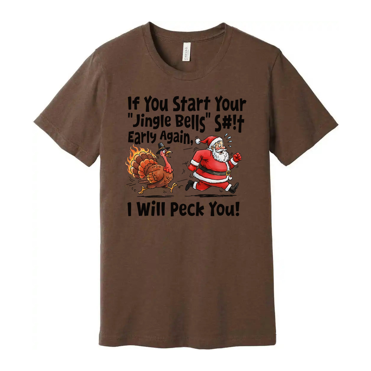 Christmas Unisex T Shirt With Santa And Turkey Cartoon And Humorous Quote About Jingle Bells I Will Peck You