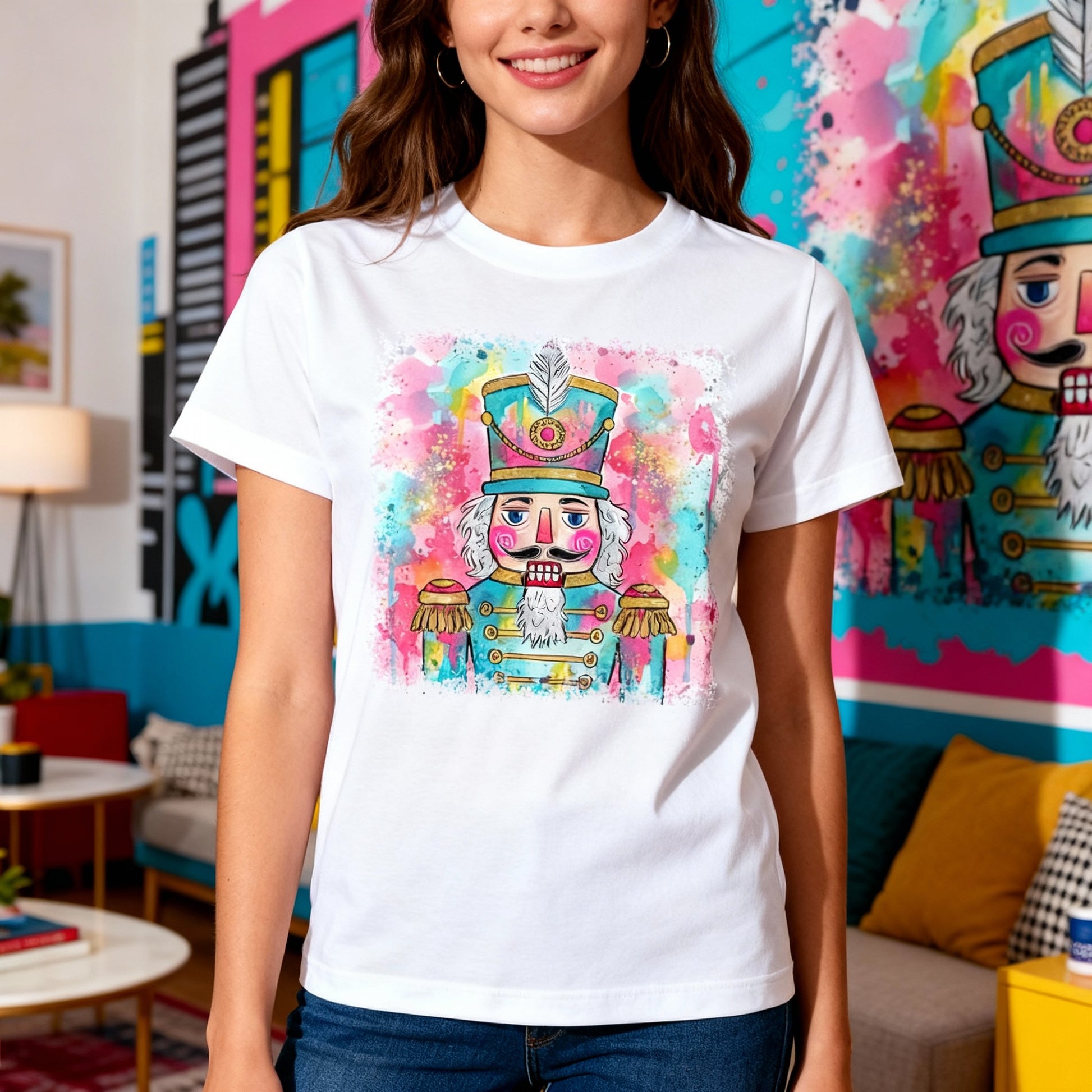Colorful Watercolor Nutcracker Soldier Graphic T Shirt For Unisex Christmas Celebration