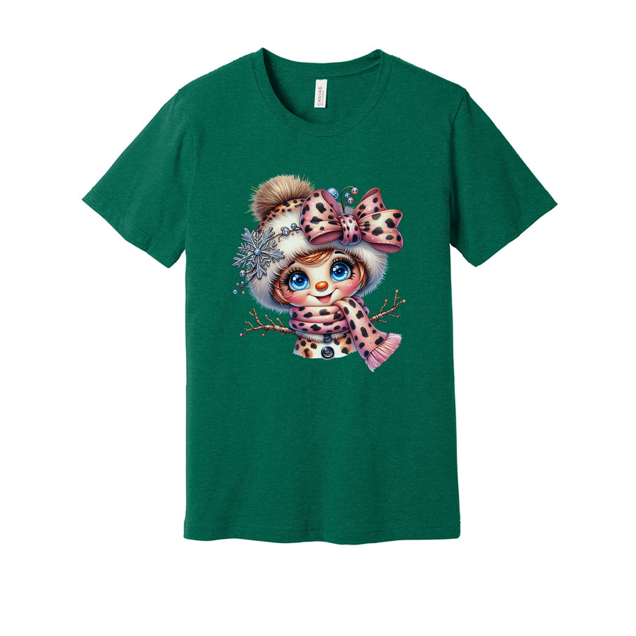 Cute Snowgirl Cartoon T Shirt With Leopard Print Scarf And Bow For Christmas And Snowflake Accessories
