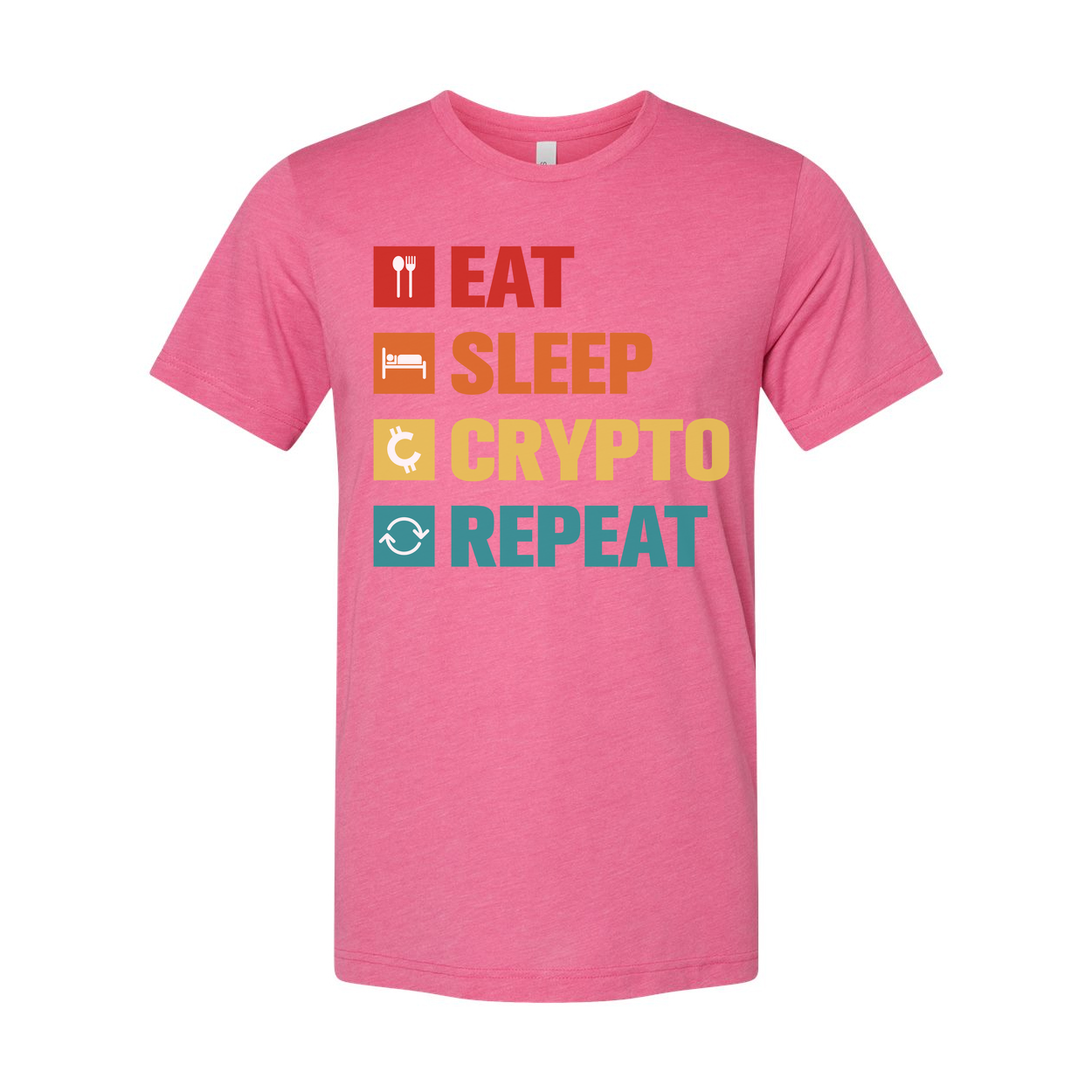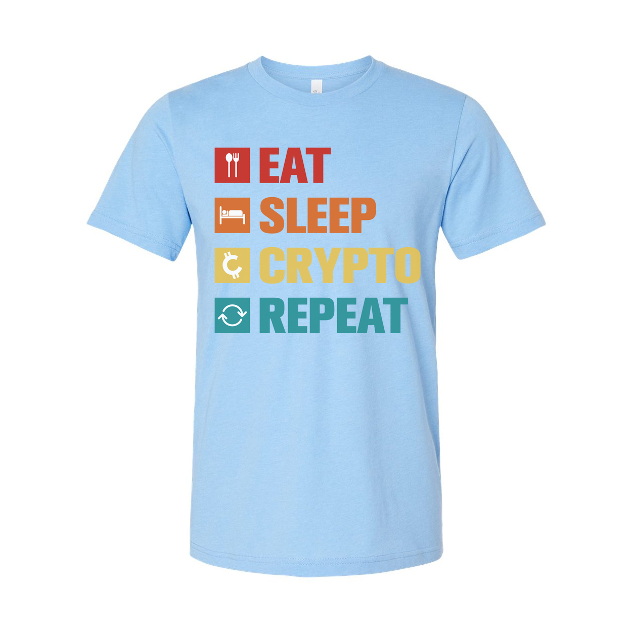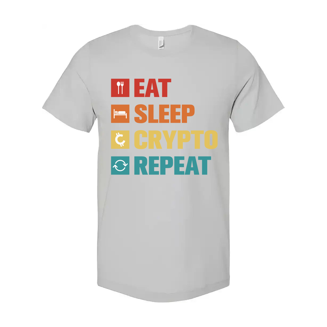Eat Sleep Crypto Repeat Unisex Graphic Tee With Colorful Blockchain Iconography for Crypto Enthusiasts