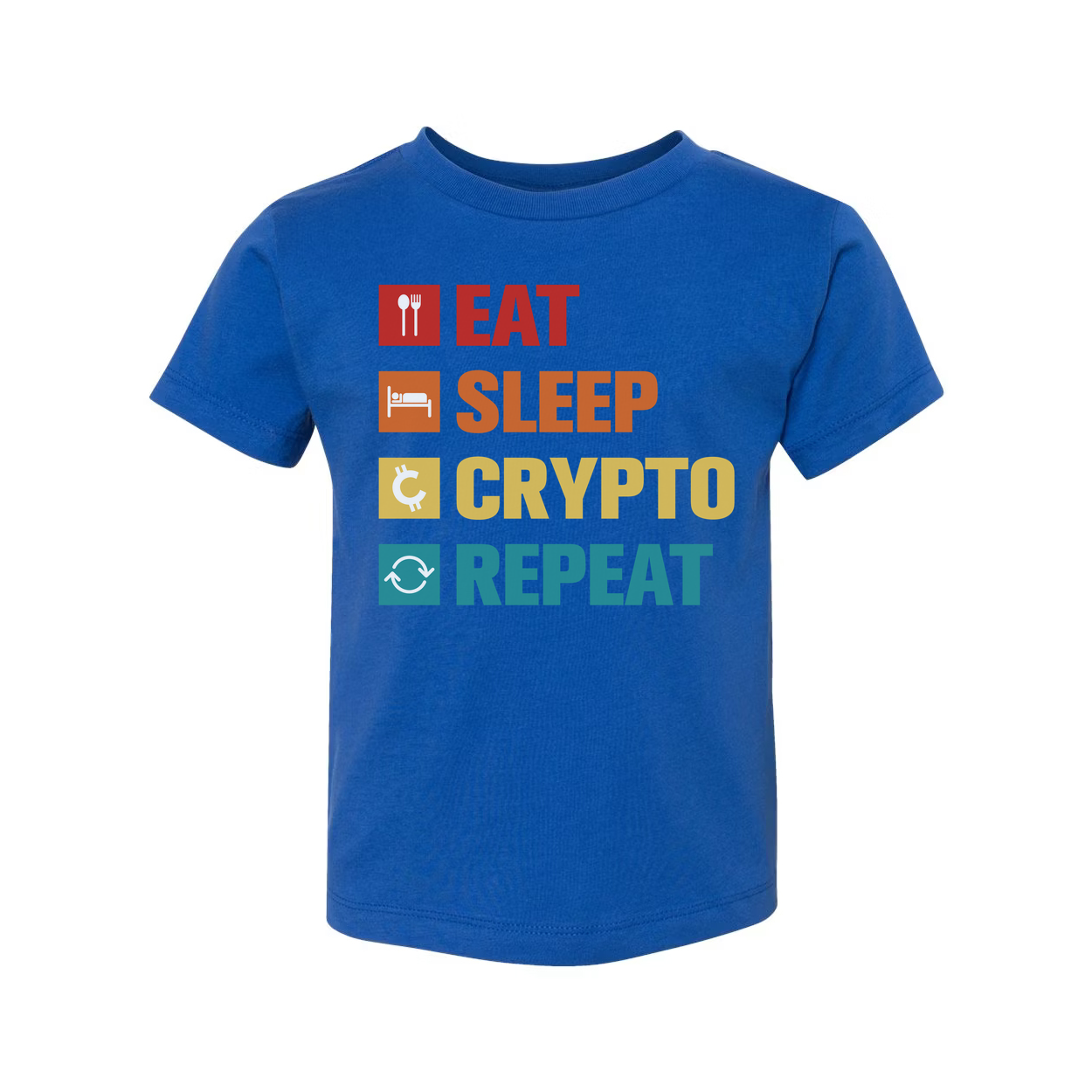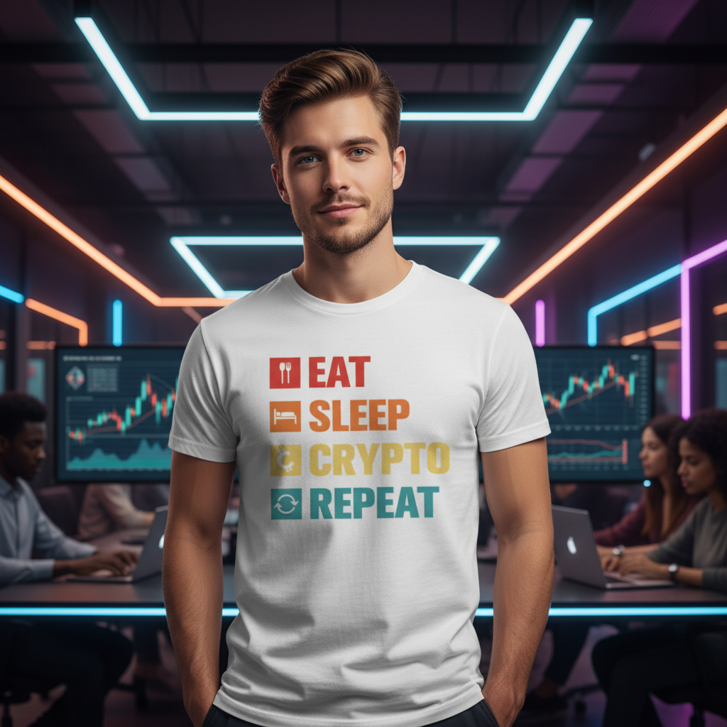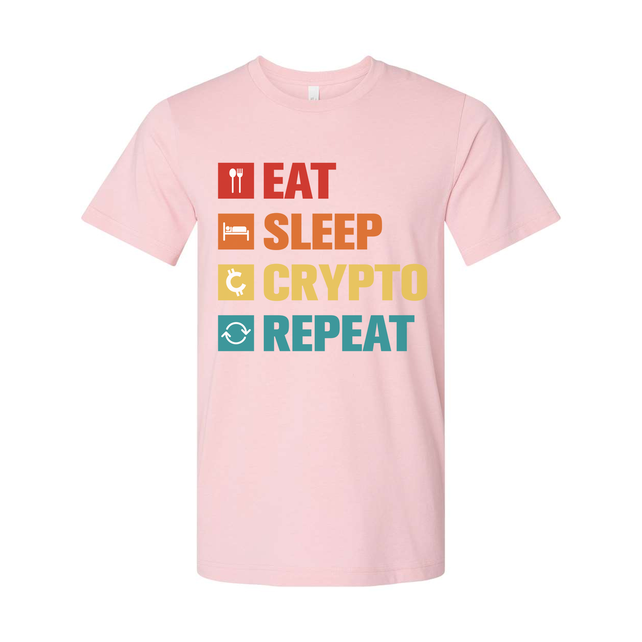 Eat Sleep Crypto Repeat Unisex Graphic Tee With Colorful Blockchain Iconography for Crypto Enthusiasts