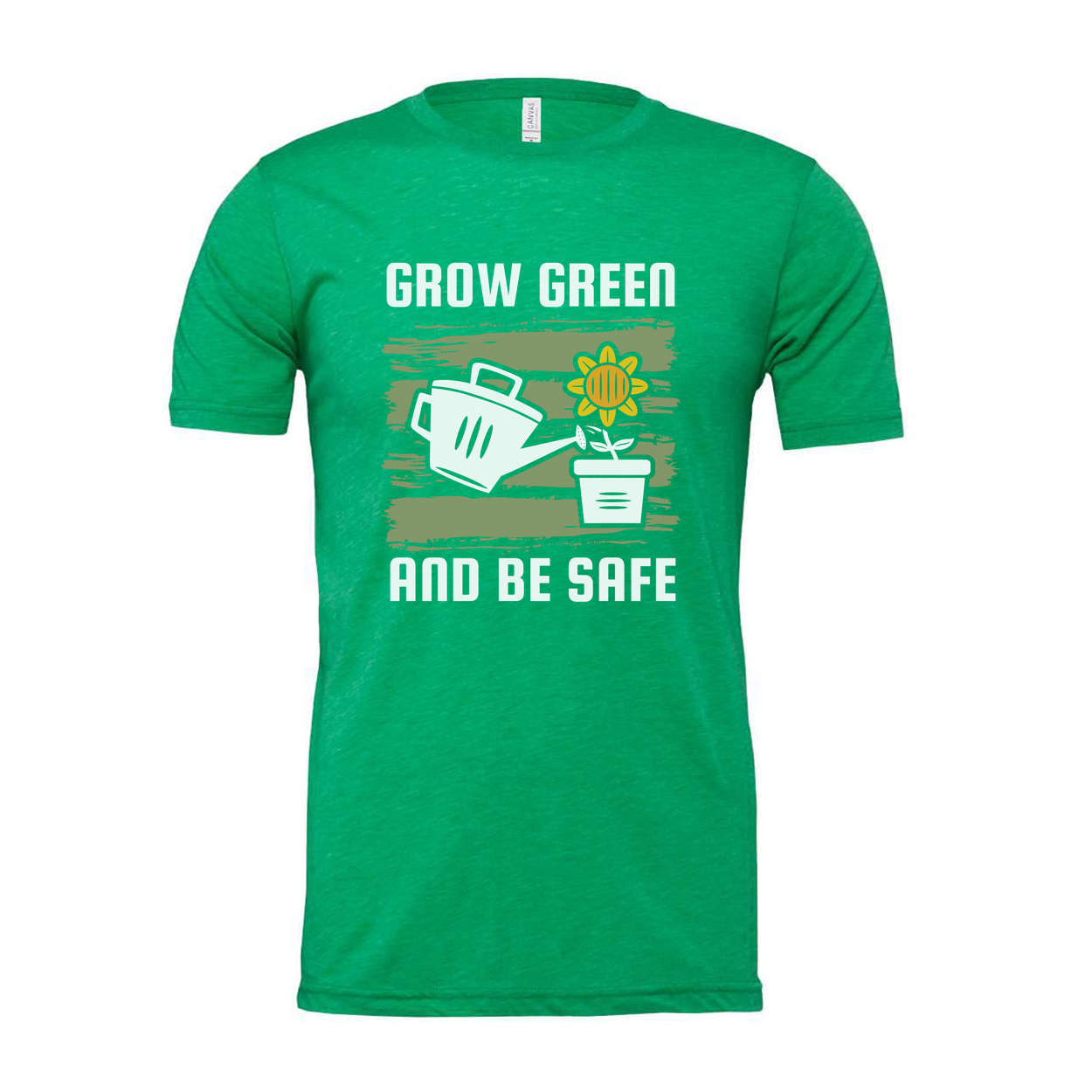 Unisex Gardening T Shirt With Grow Green And Be Safe Design Featuring Watering Can And Sunflower