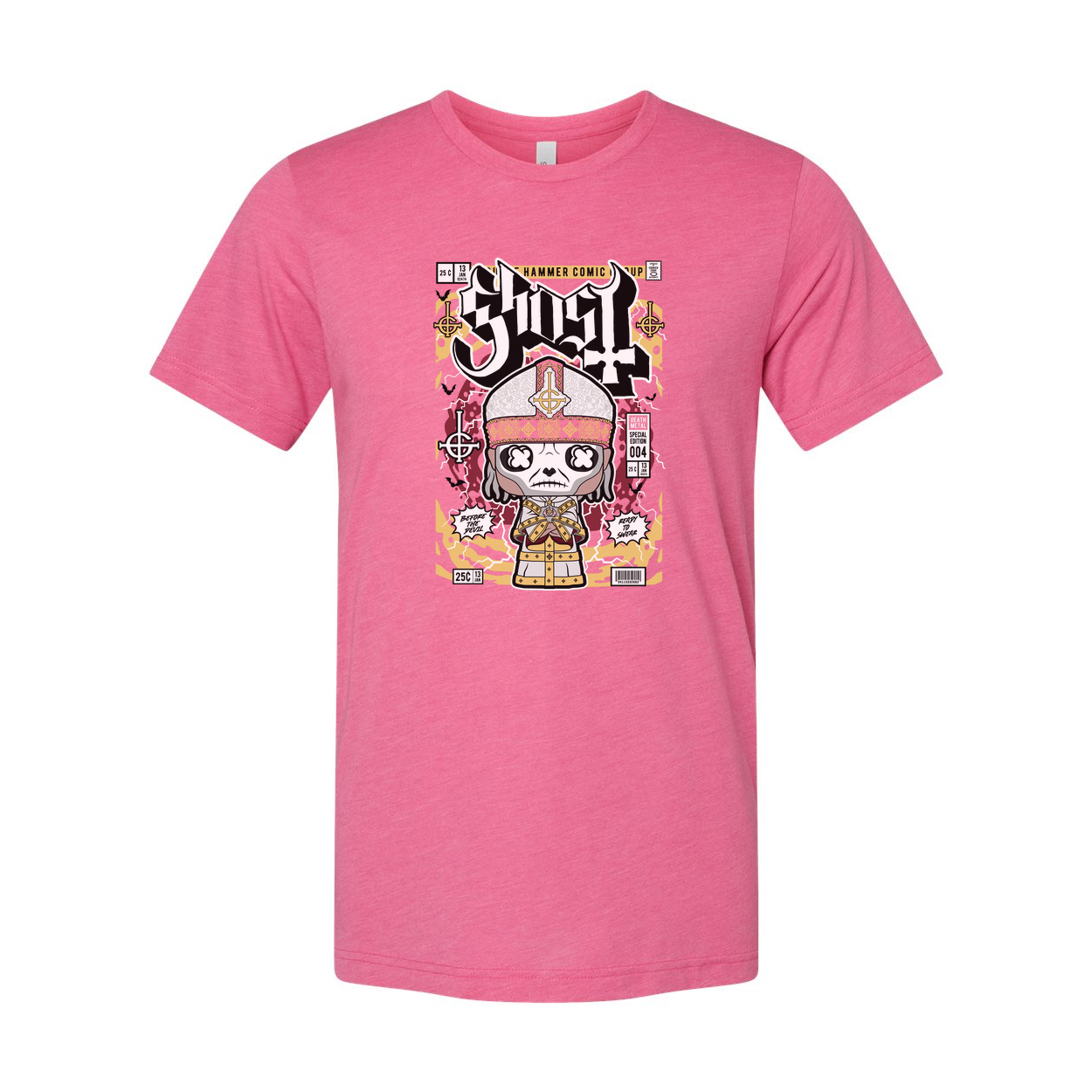 Ghost Band Graphic Tee Featuring Cartoon Papal Skeleton Design On Unisex Short Sleeve Shirt