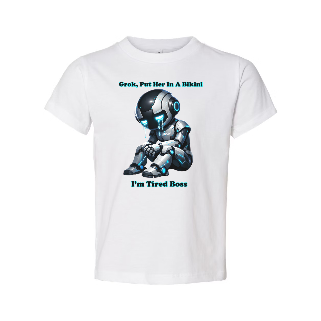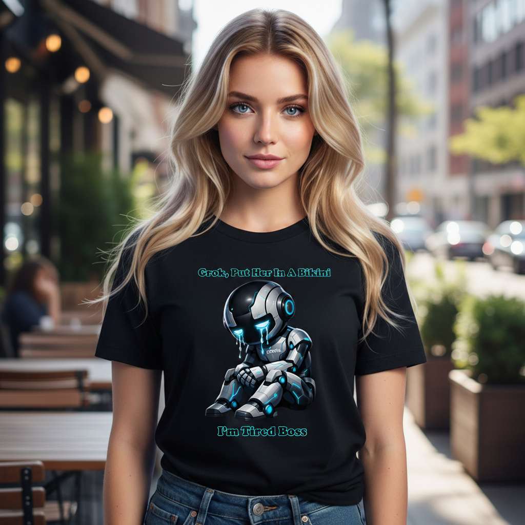 Grok Put Her In A Bikini Unisex Graphic Tee With Crying Futuristic Robot And Tired Boss