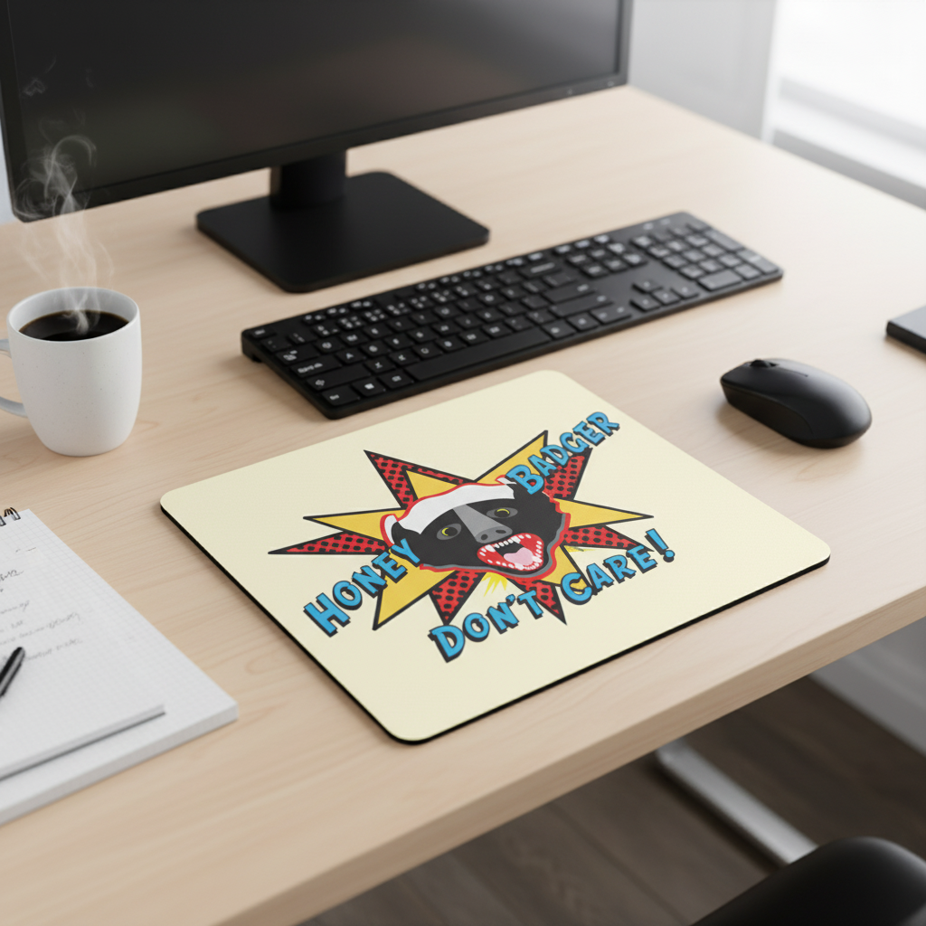 Elevate your workspace with the Honey Badger Does Not Care Thick Mouse Pad — a bold desk pad designed for focused work and smooth mouse control. This thick pad combines a playful, comic-inspired graphic with a practical surface, making it a standout accessory for any desk setup.