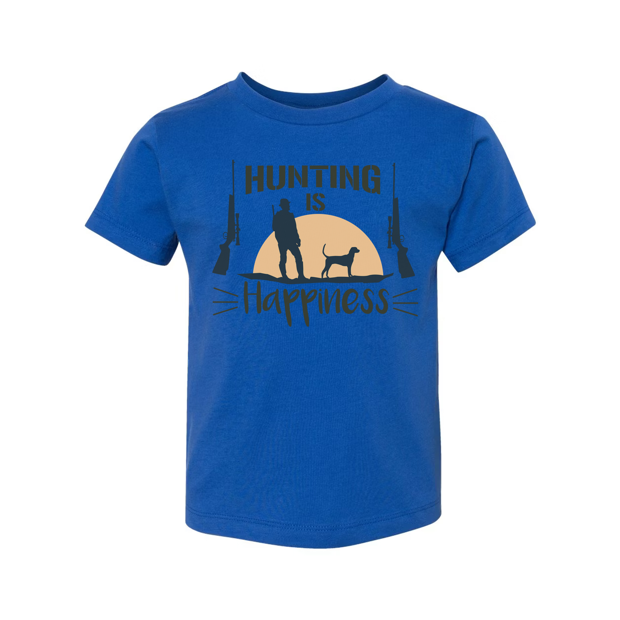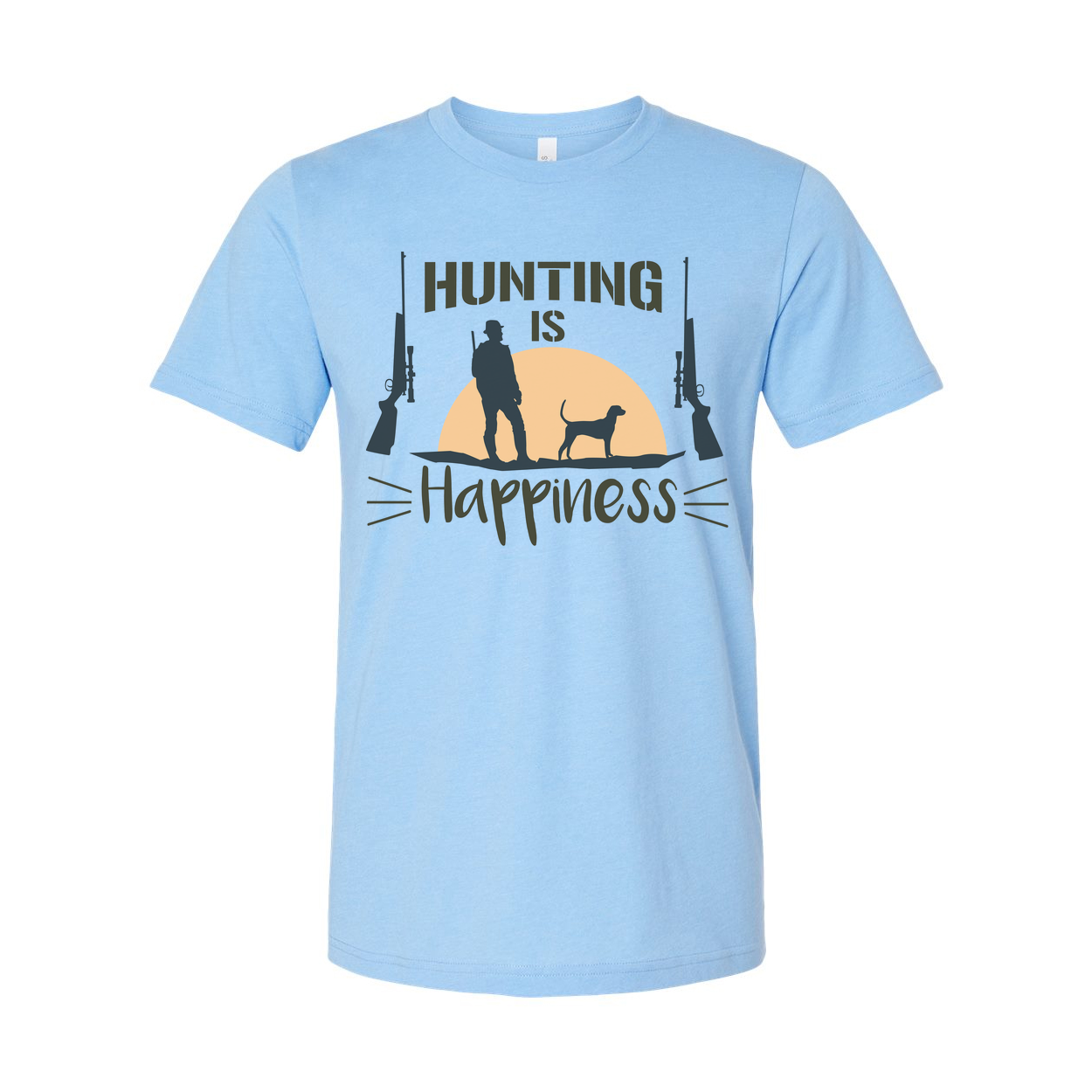 Hunting Is Happiness Unisex Graphic Tee With Hunter Silhouette, Dog, And Sunset Design