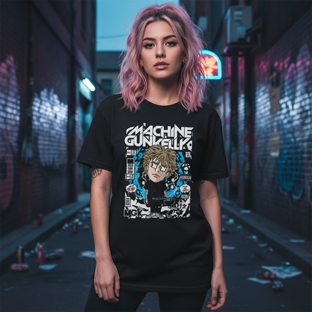 Machine Gun Kelly Cartoon Graphic Tee With Musician Illustration And Comic Panels