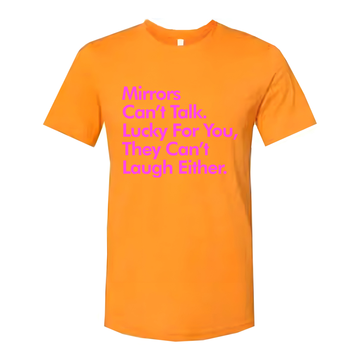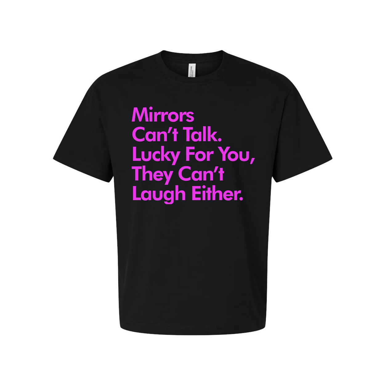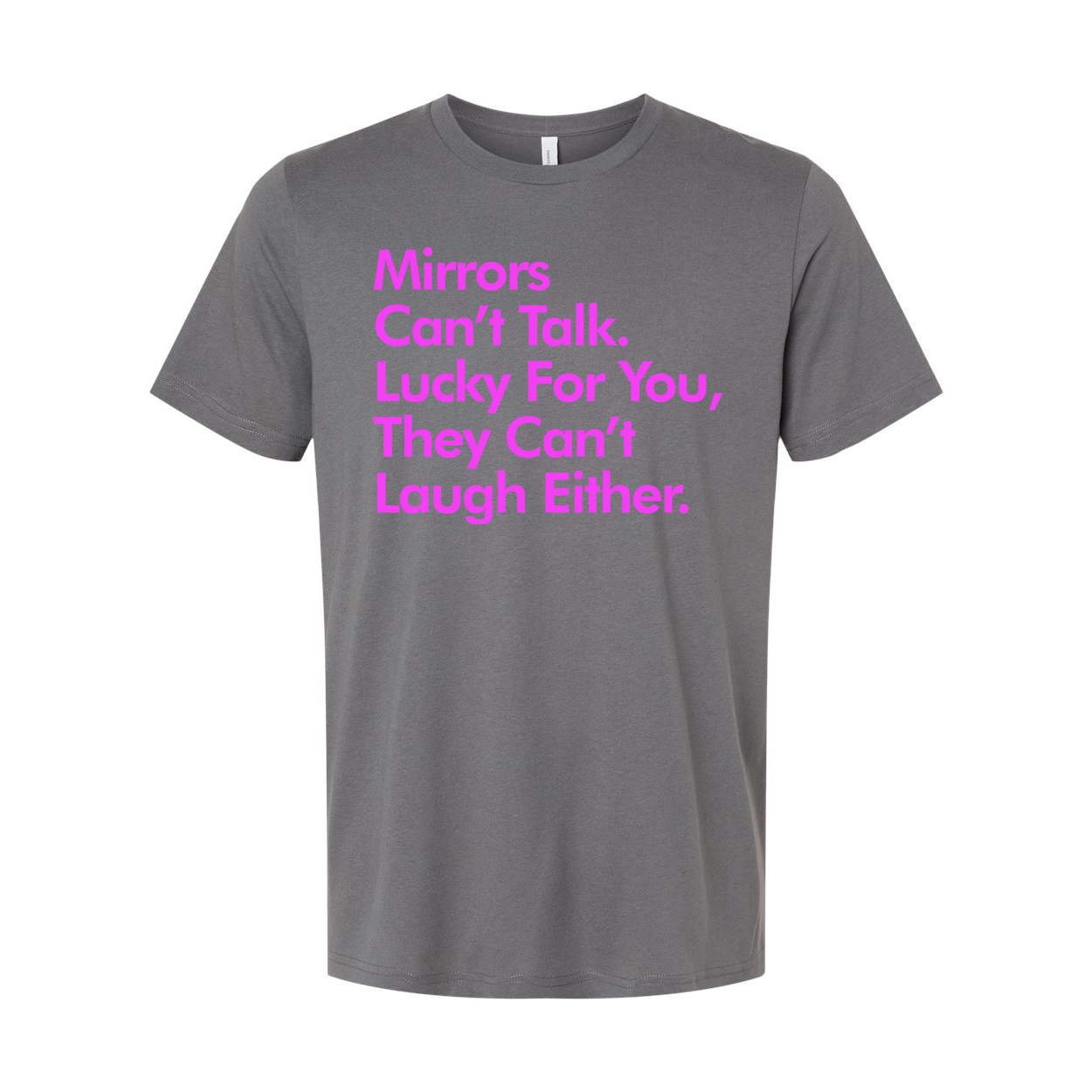 Mirrors Can't Talk They Can't Laugh Either Unisex Graphic Tee For Everyday Casual Wear With Pink Text