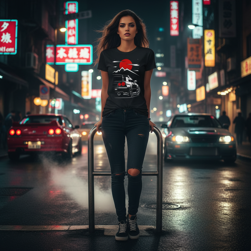 Nissan Skyline GTR R34 Unisex Graphic T Shirt With Japanese Sun And Mountain Illustration