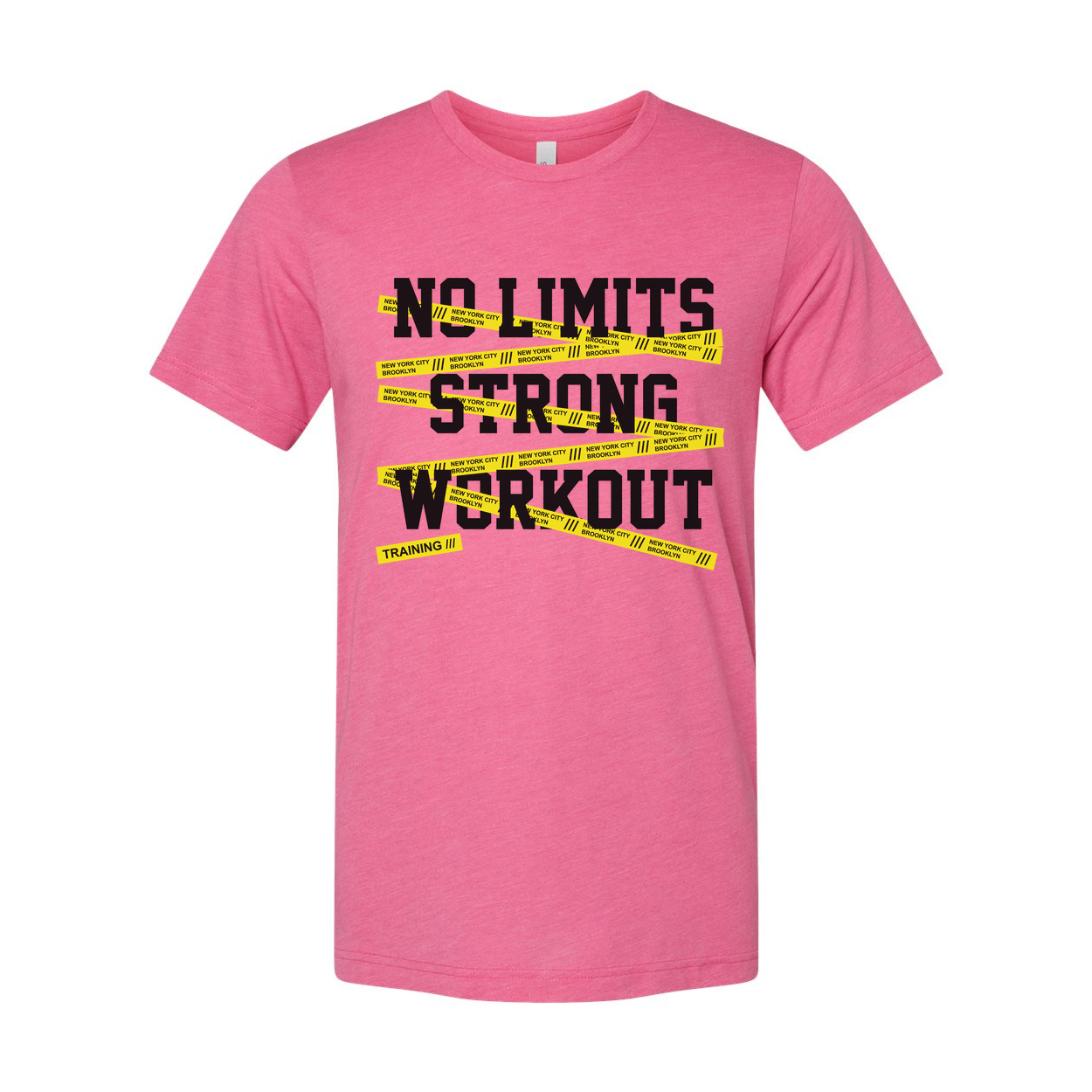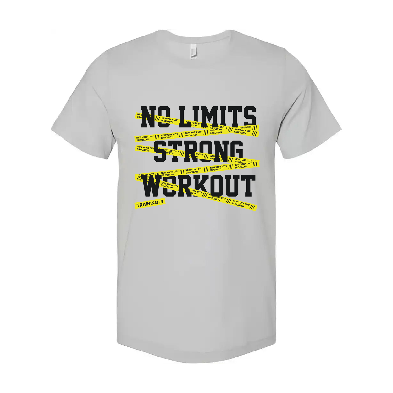 No Limits Strong Workout Unisex T Shirt With Yellow Caution Tape Graphic For Training