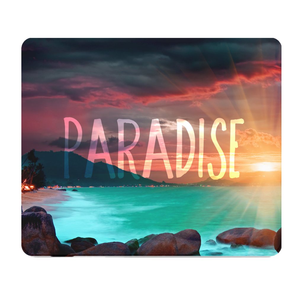 - Vivid ocean and beach artwork: A turquoise sea, warm sunset tones, and a bold “Paradise” motif to brighten your setup.