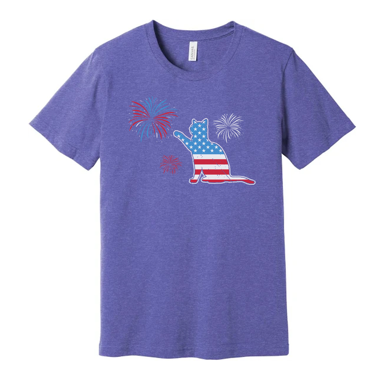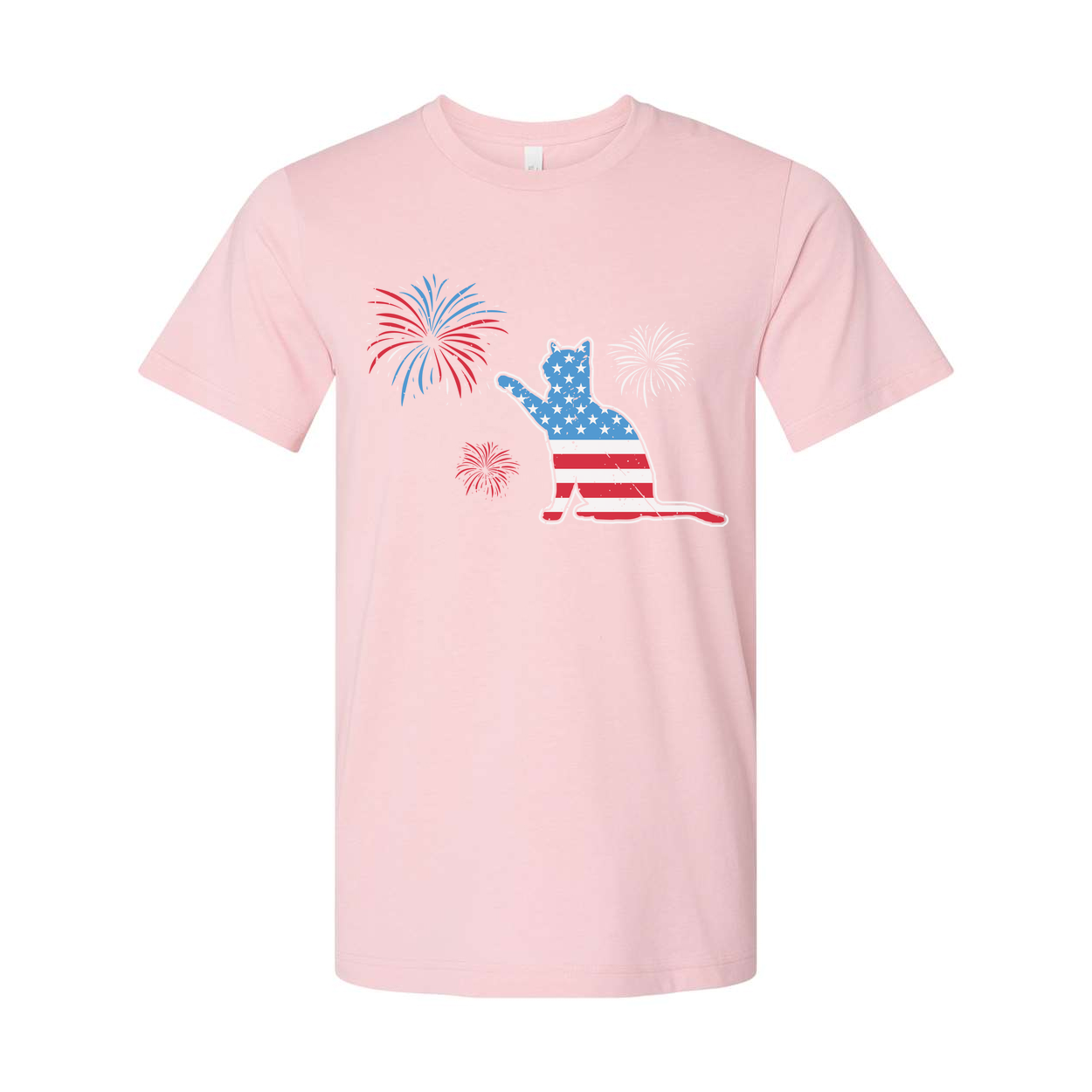 Patriotic Cat Graphic T Shirt With American Flag Pattern And Firework Design Unisex