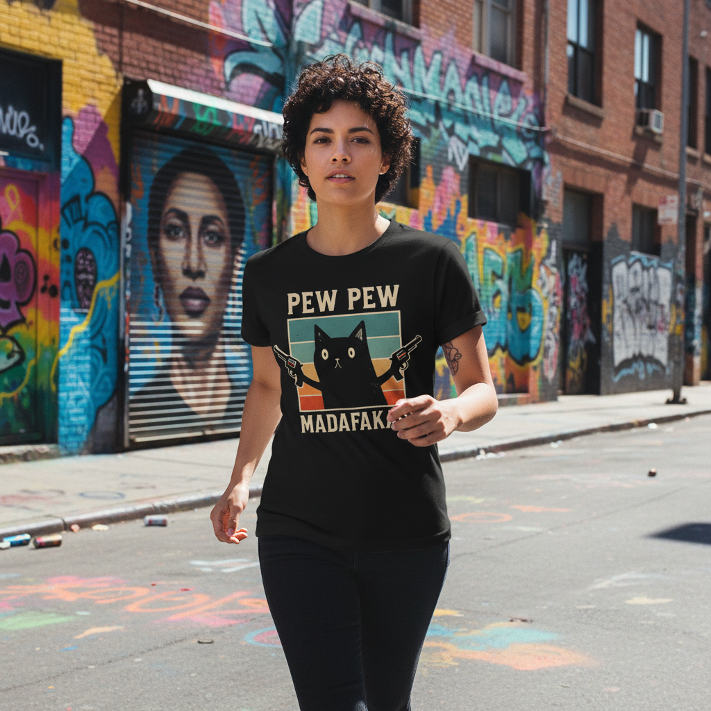 Bold, playful, and built for everyday wear, this unisex premium graphic tee features a white cat at the center, flanked by two pistols and a retro color-block backdrop—topping it off with the text “PEW PEW MADAFAKAS.” Designed for fans of bold, streetwear-inspired graphics who want a fun statement piece.