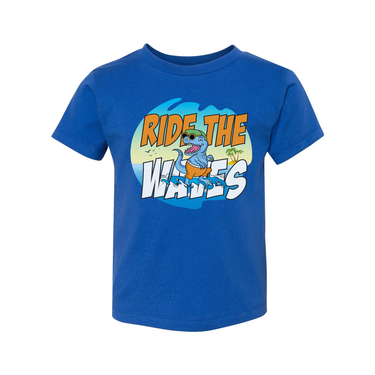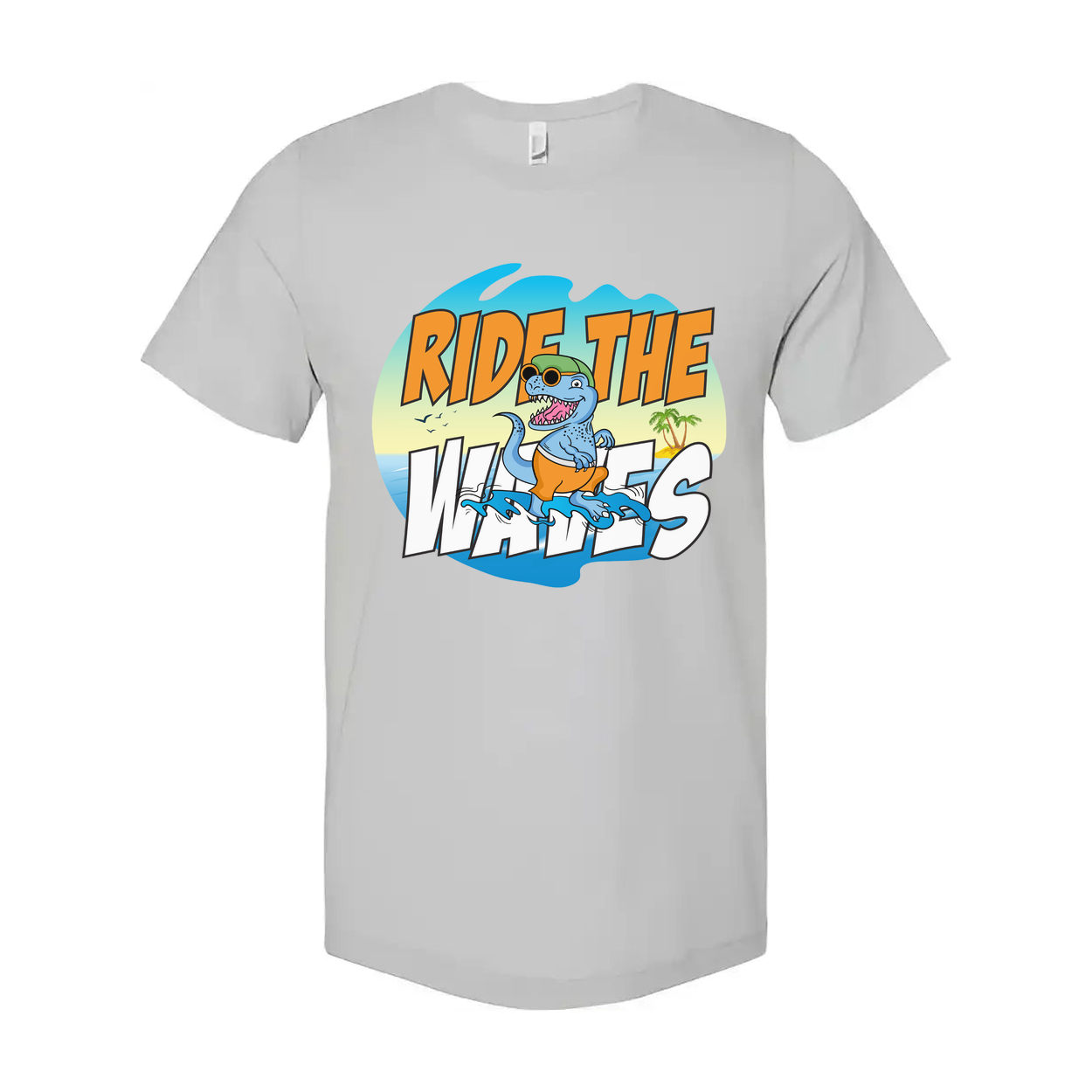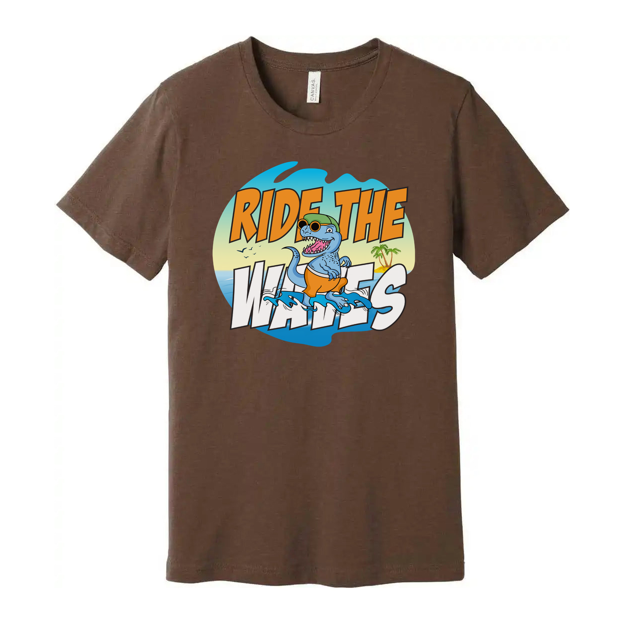 Ride The Waves Dinosaur Surfing T Shirt For Men Women Unisex Graphic Tee Beach Vibe Fun Artwork