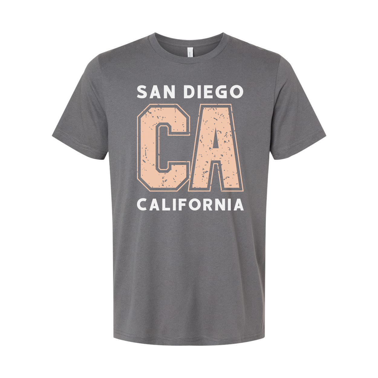 San Diego California Unisex Graphic T Shirt With Large Distressed Peach CA Lettering