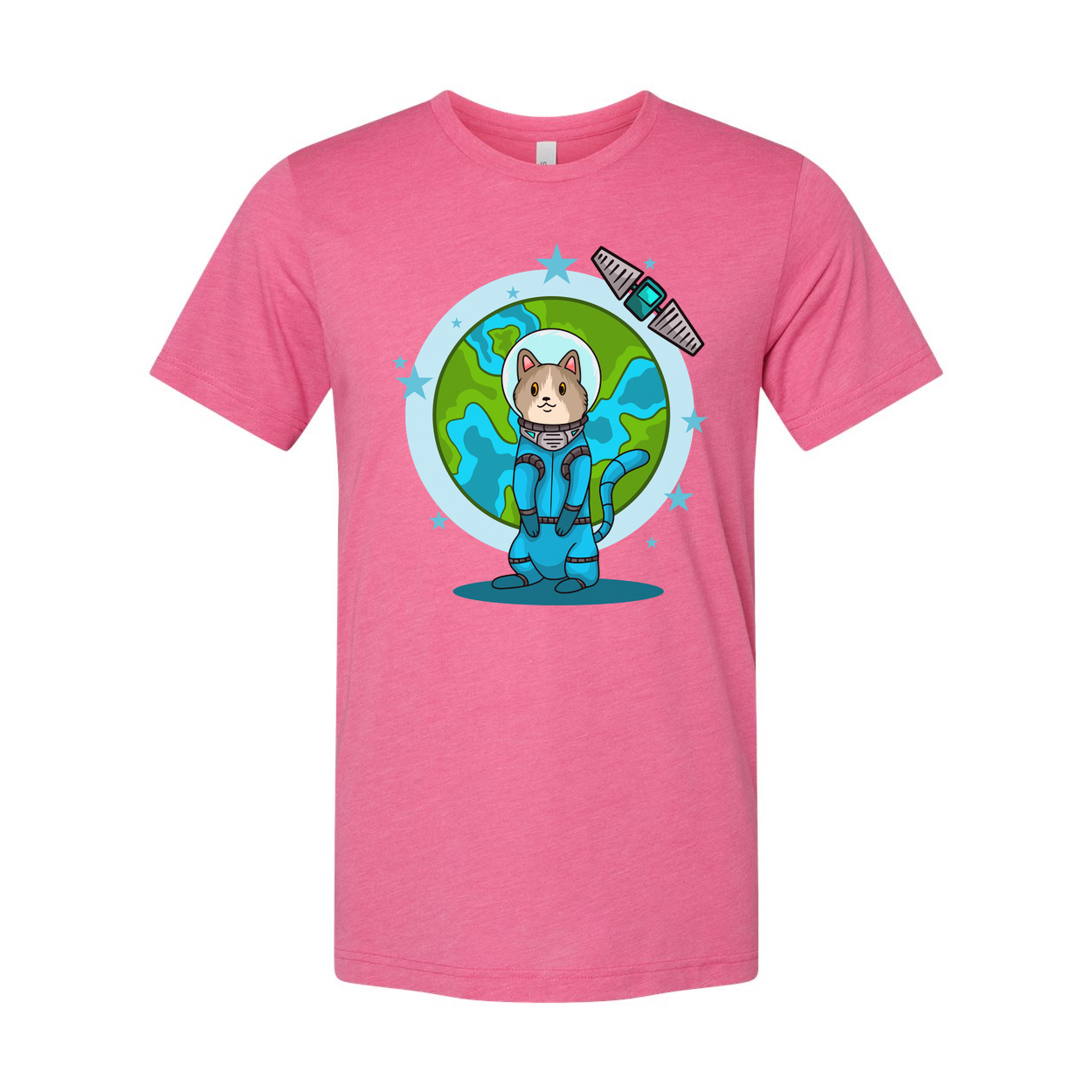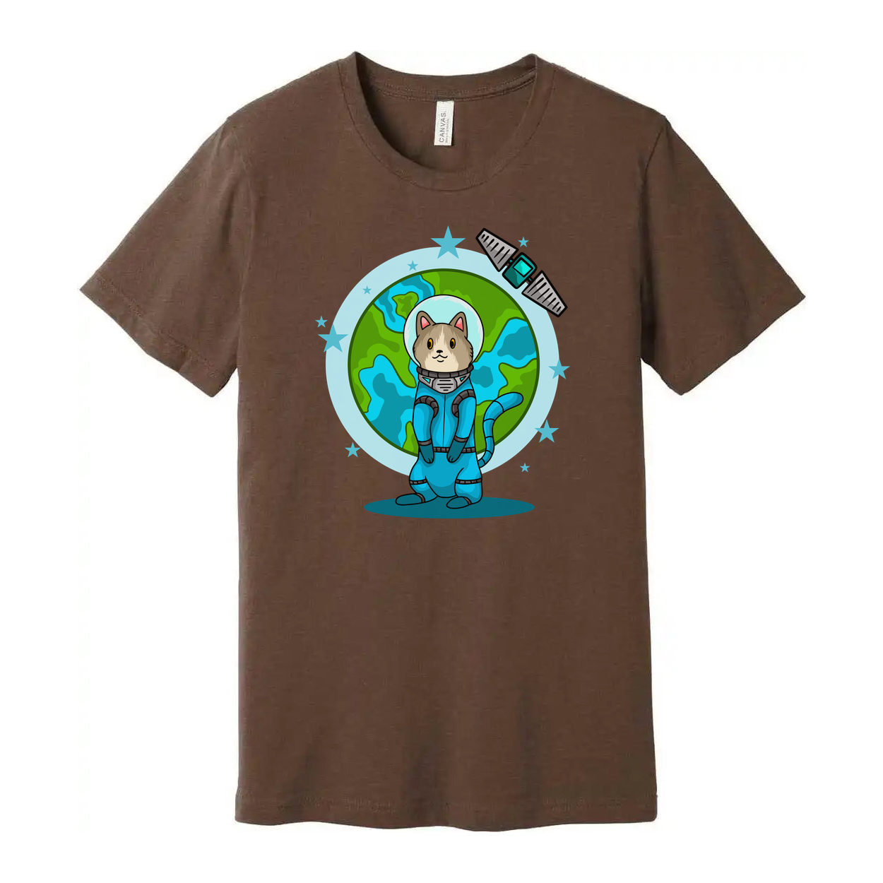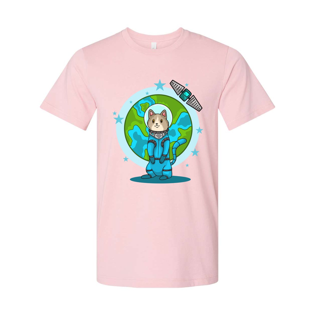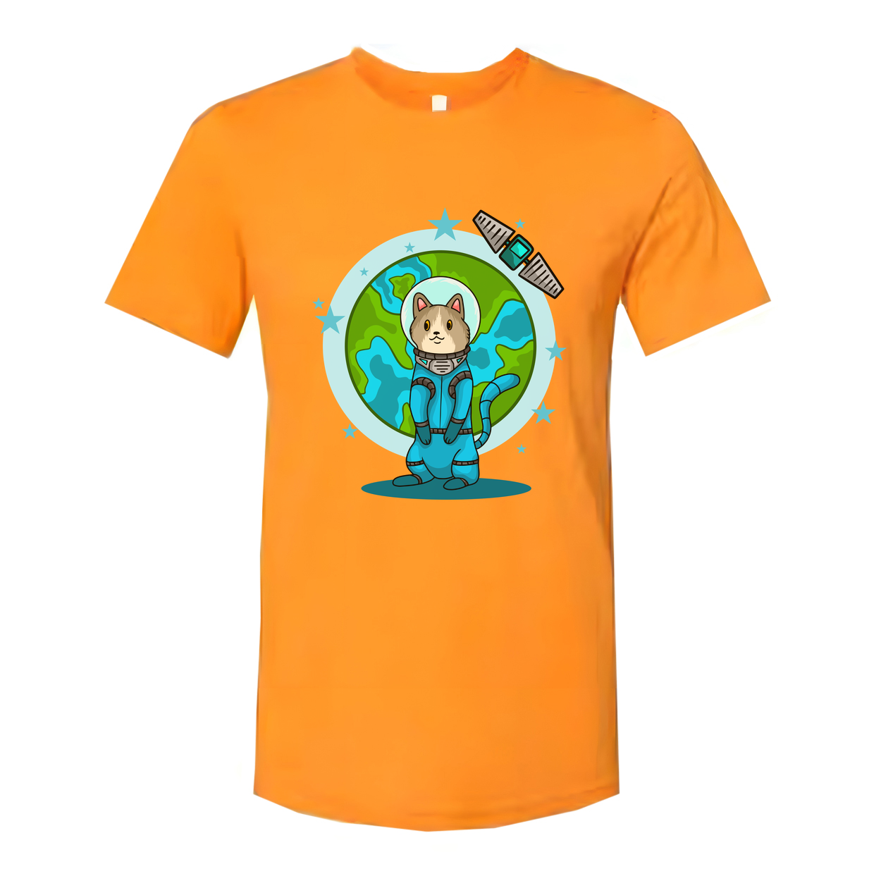 Space Animals Cat In Spacesuit T Shirt With Earth Backdrop And Satellite Graphic Design