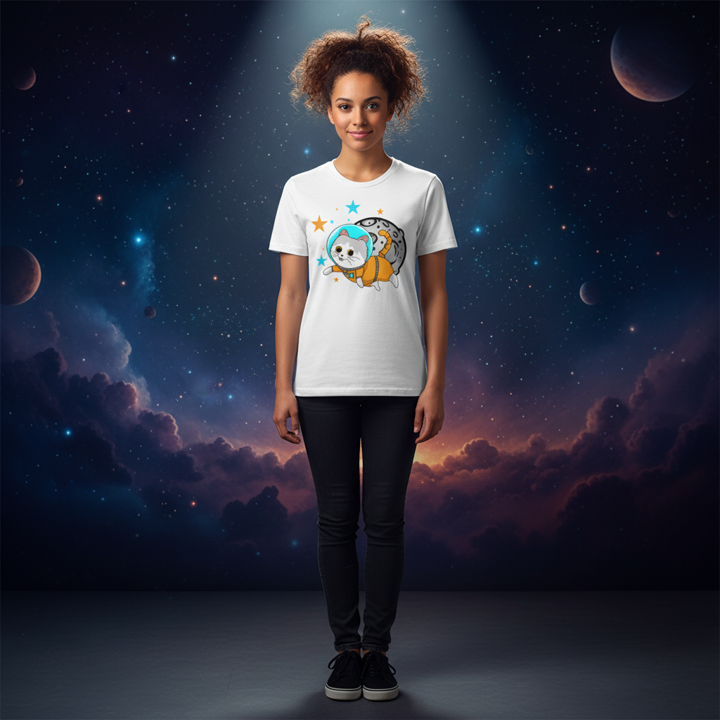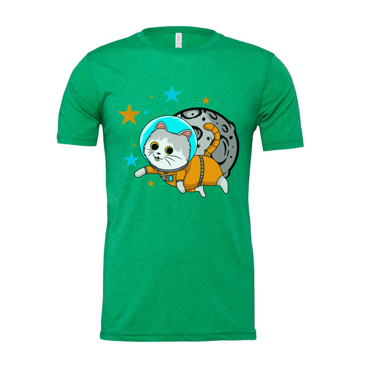 Space Cat Astronaut Cartoon Unisex T Shirt With Orange Spacesuit And Moon Backdrop