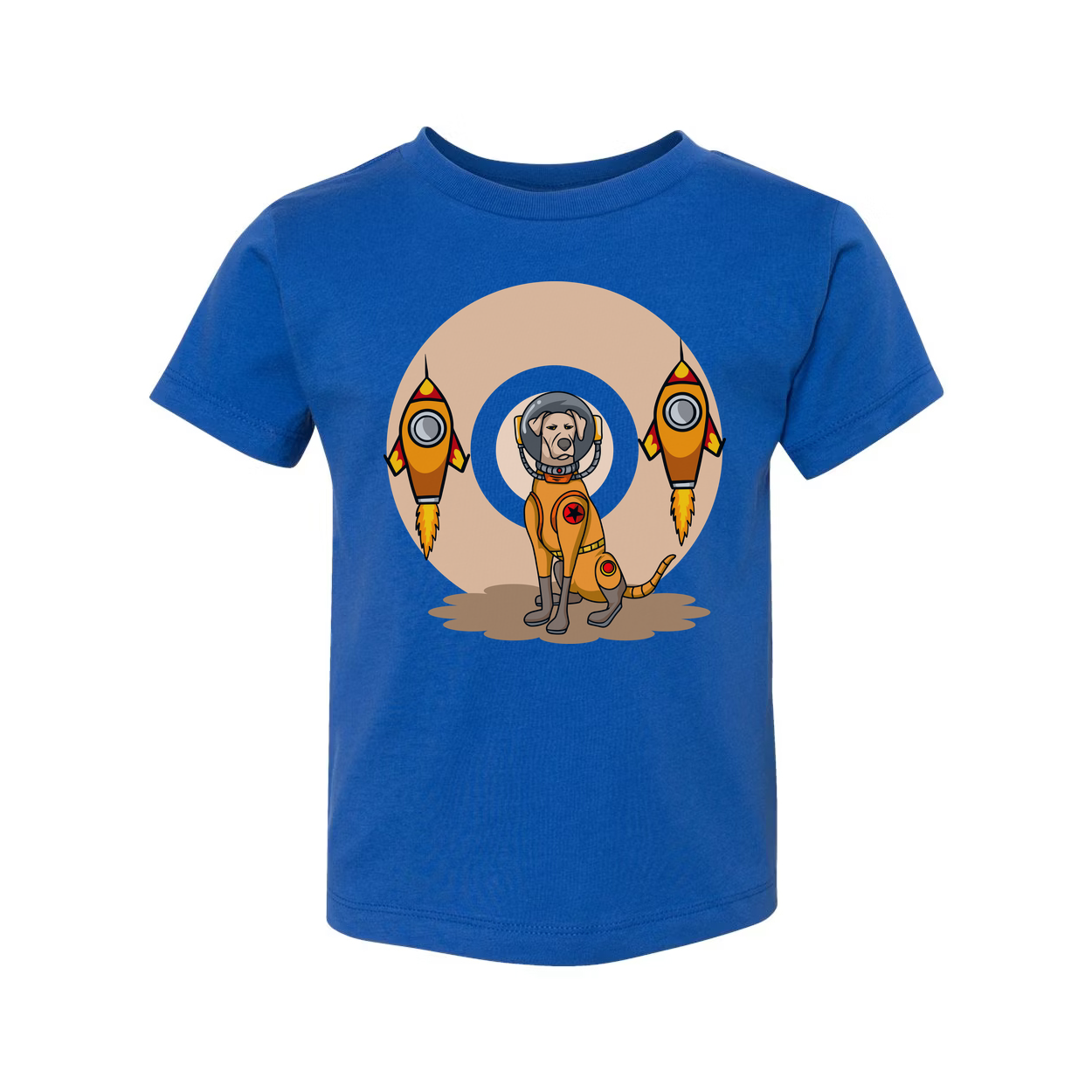 Space Explorer Dog T Shirt With Orange Lunar Rockets Design For Unisex Adults Enthusiasts