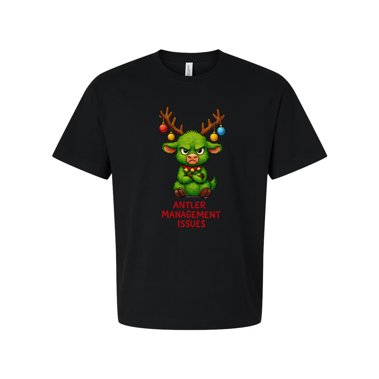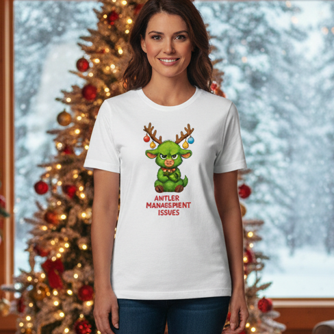 Unisex Antler Management Issues Graphic T Shirt Featuring Grumpy Green Antlered Creature With Christmas Ornaments