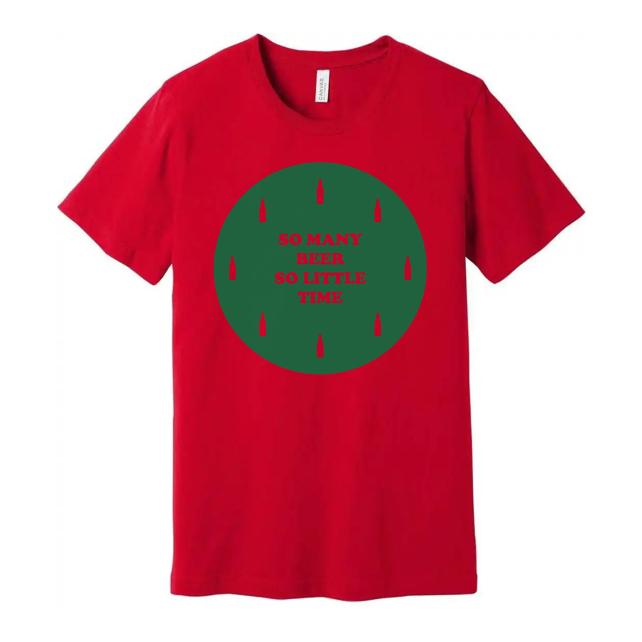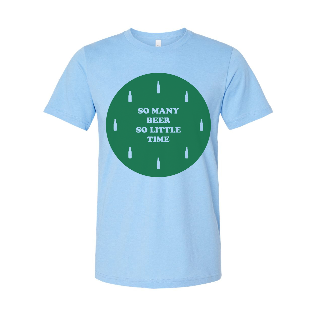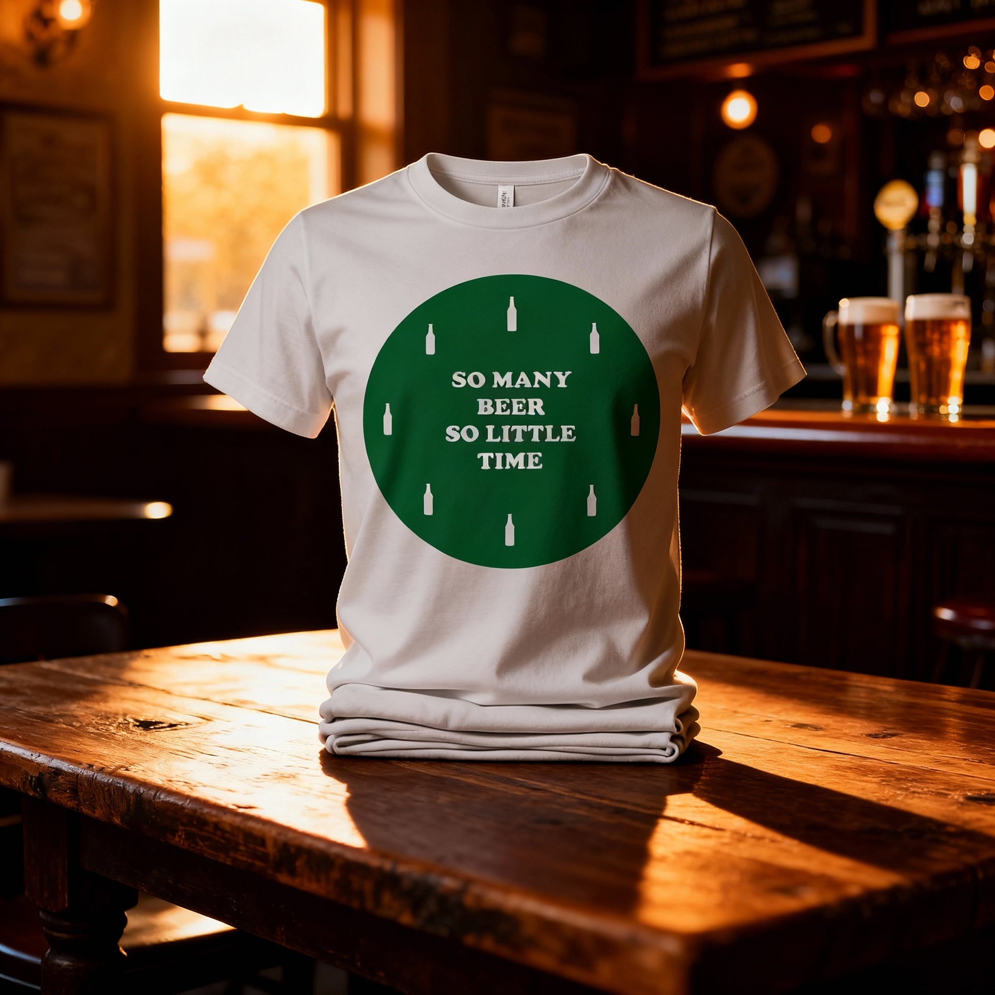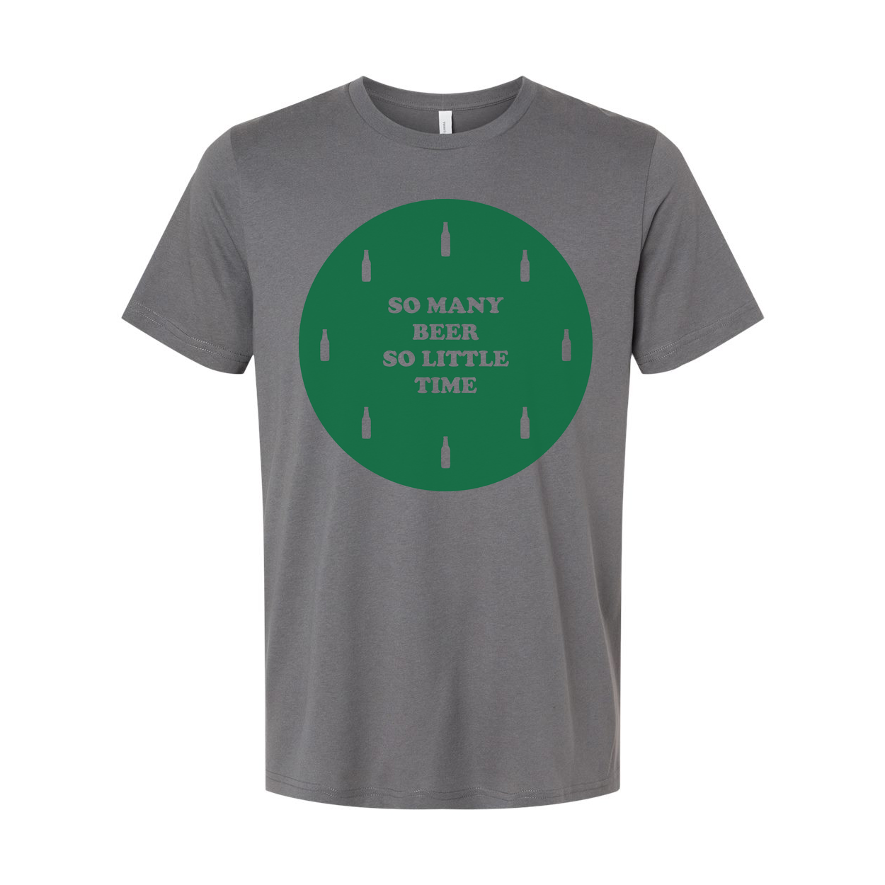 Unisex Beer Graphic T Shirt With Green Circular Design And Bottle Icons On Front