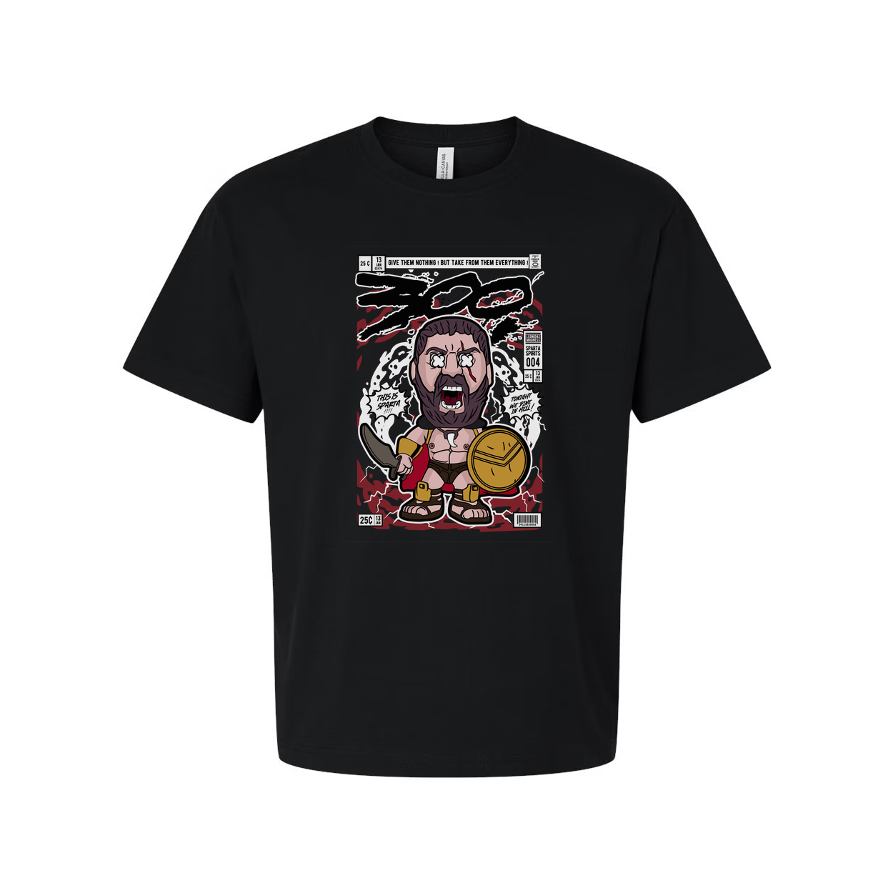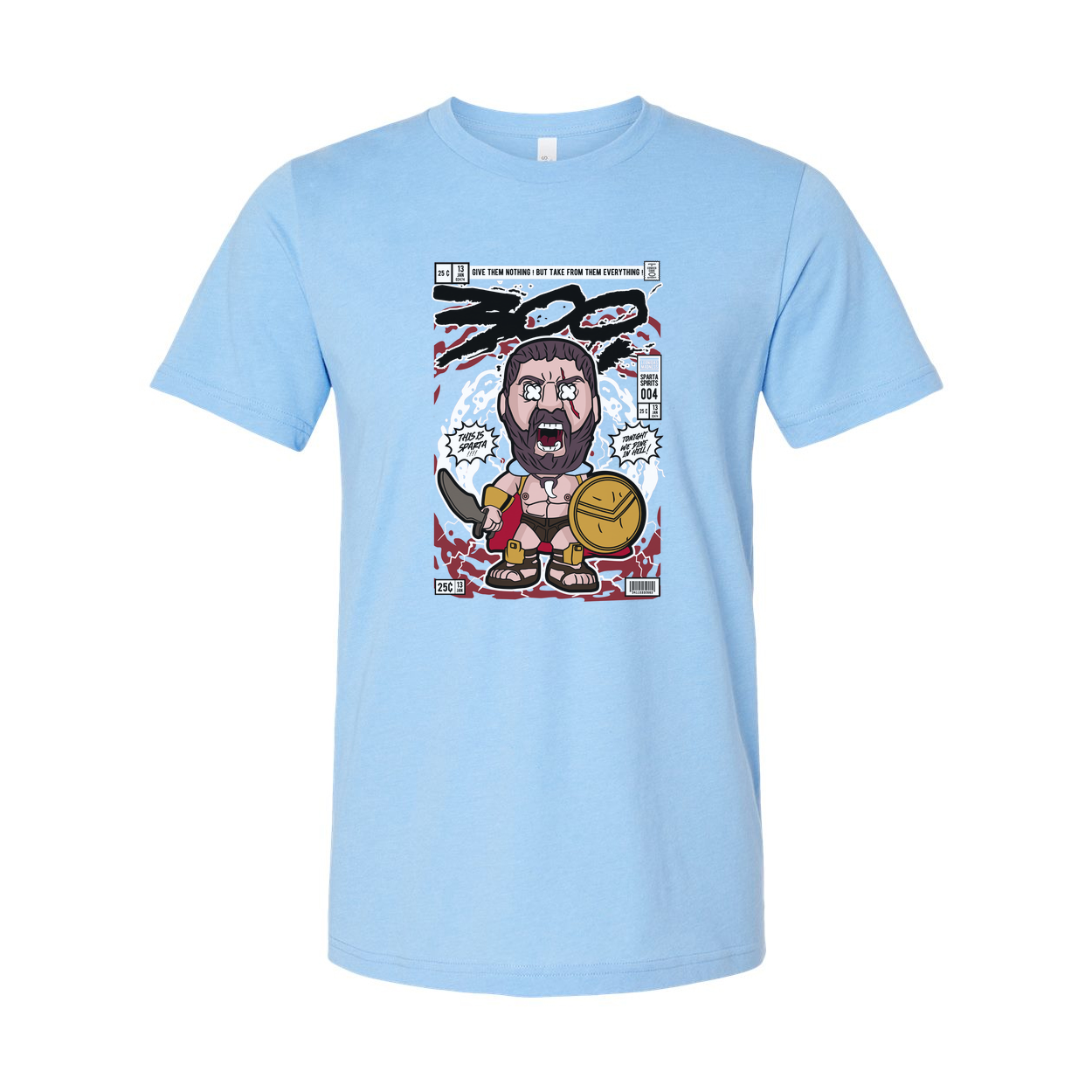 Unisex Cartoon Spartan Warrior Comic Style T Shirt With Shield And Sword Graphic Design