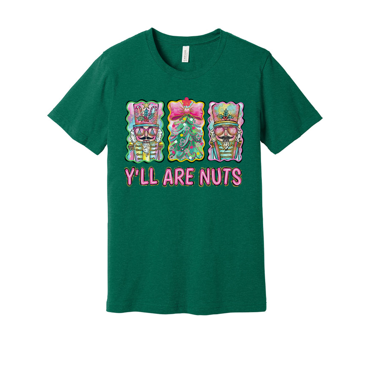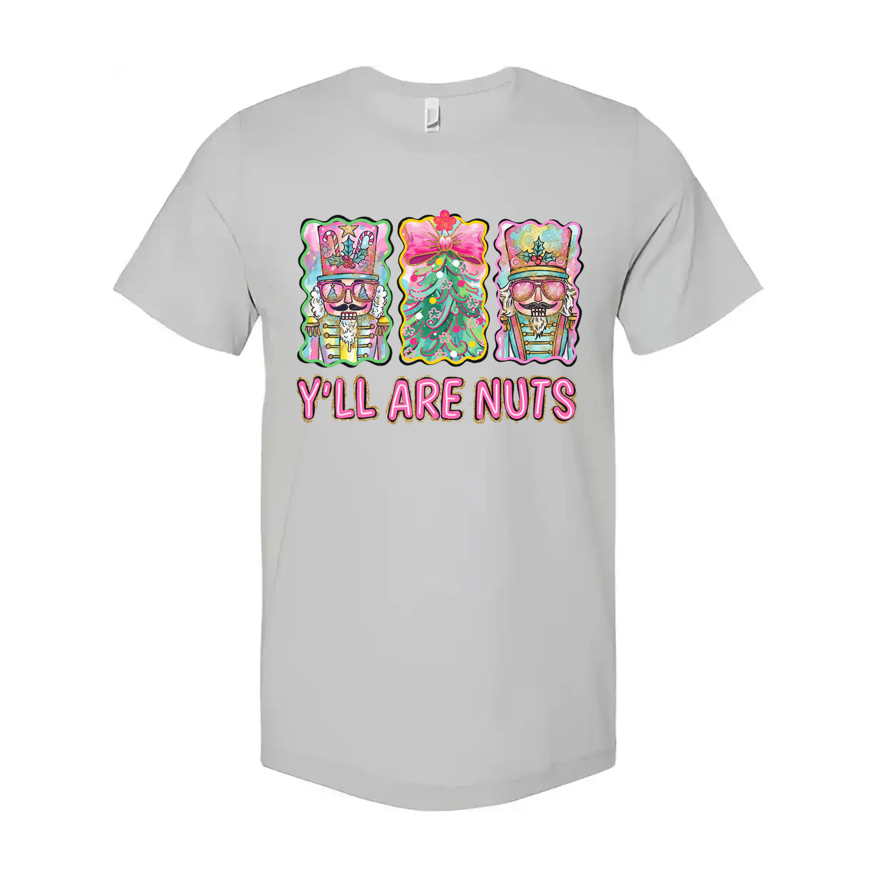 Unisex Christmas T Shirt Featuring Colorful Nutcrackers And Christmas Tree With Y'LL ARE NUTS Phrase