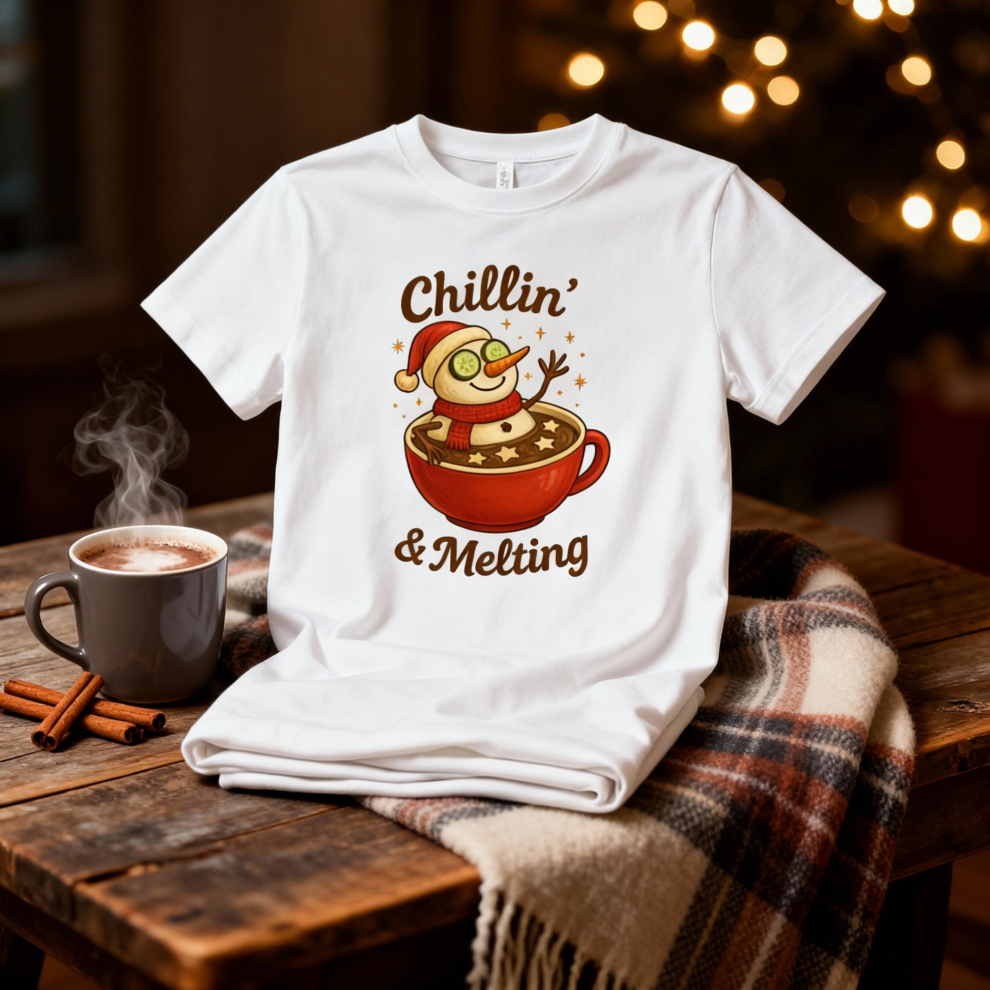 Unisex Christmas T Shirt White Graphic Tee Chillin And Melting Snowman Mug Hot Cocoa Design