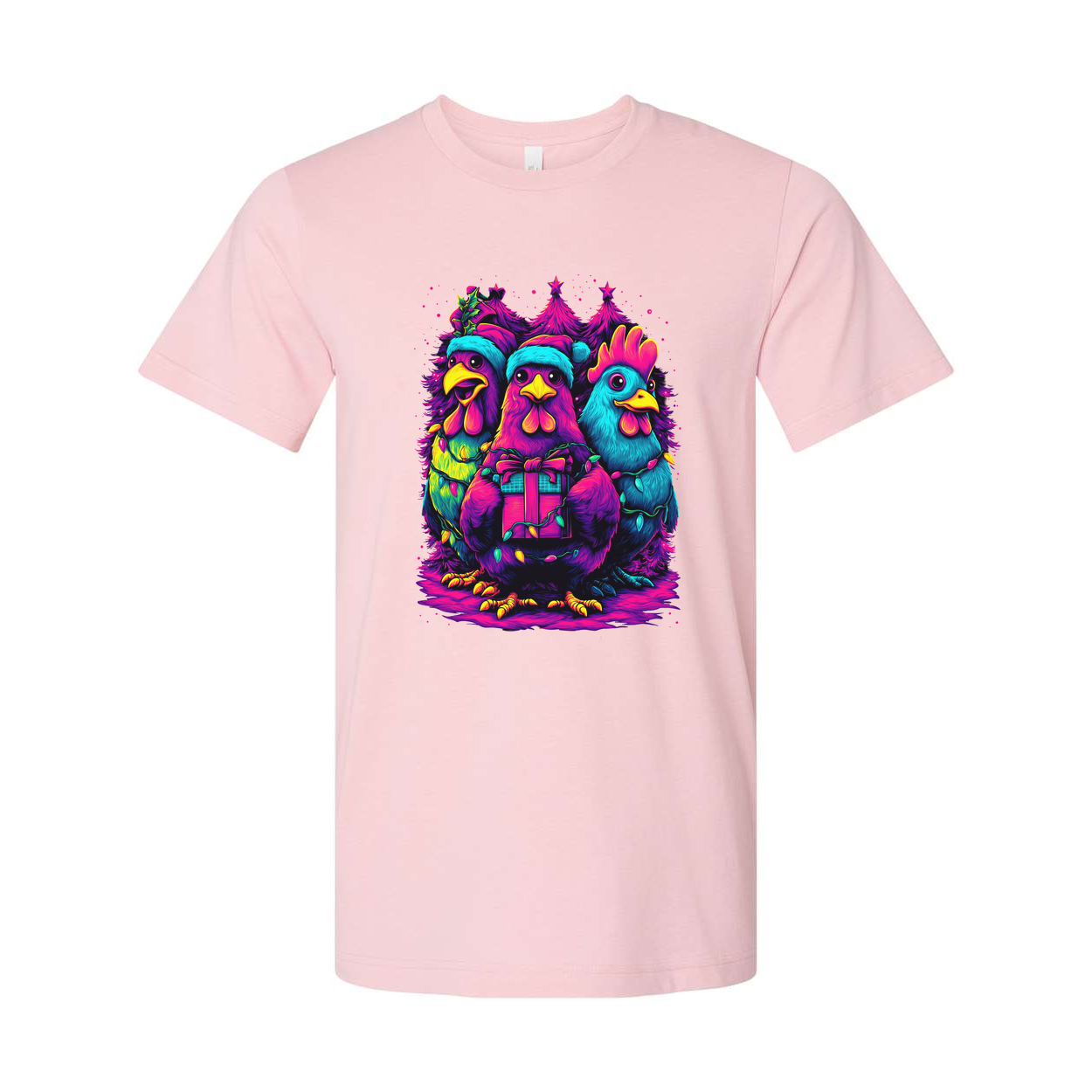 Unisex Christmas T Shirt With Neon Colorful Chickens Gift Box And Christmas Trees Graphic