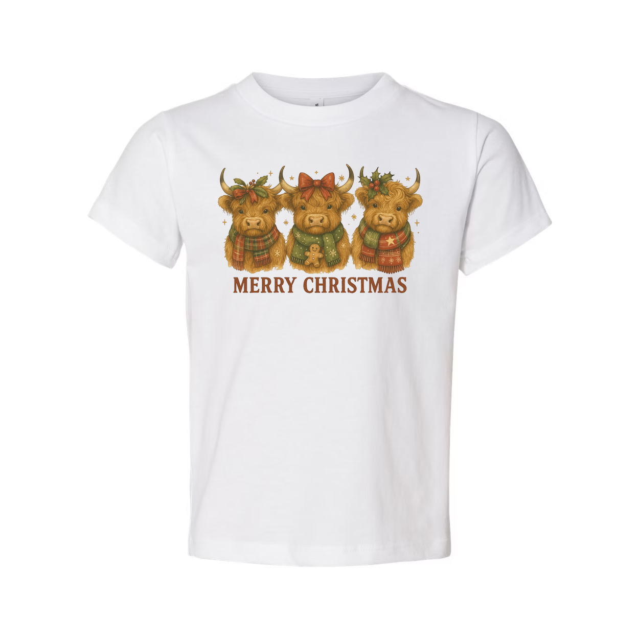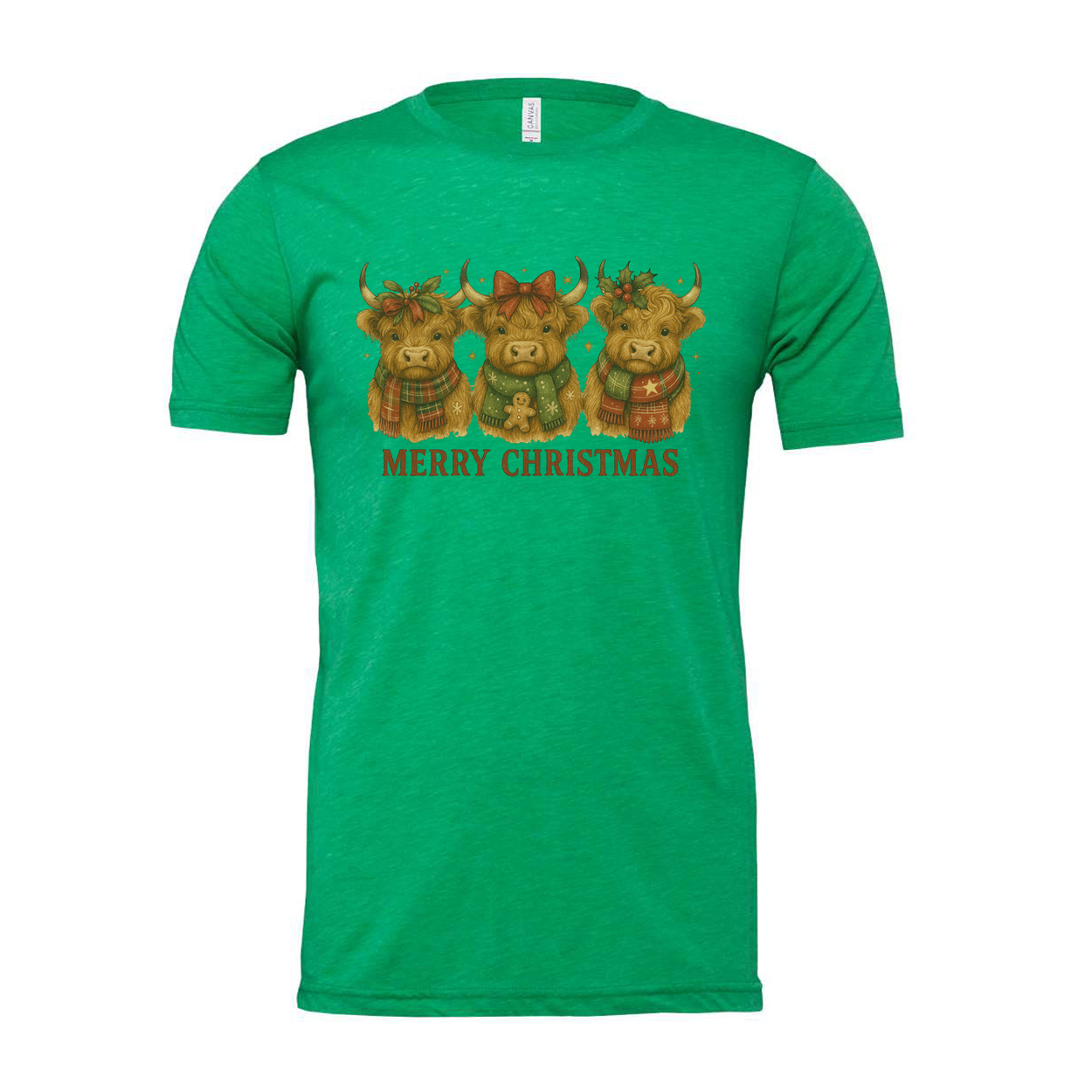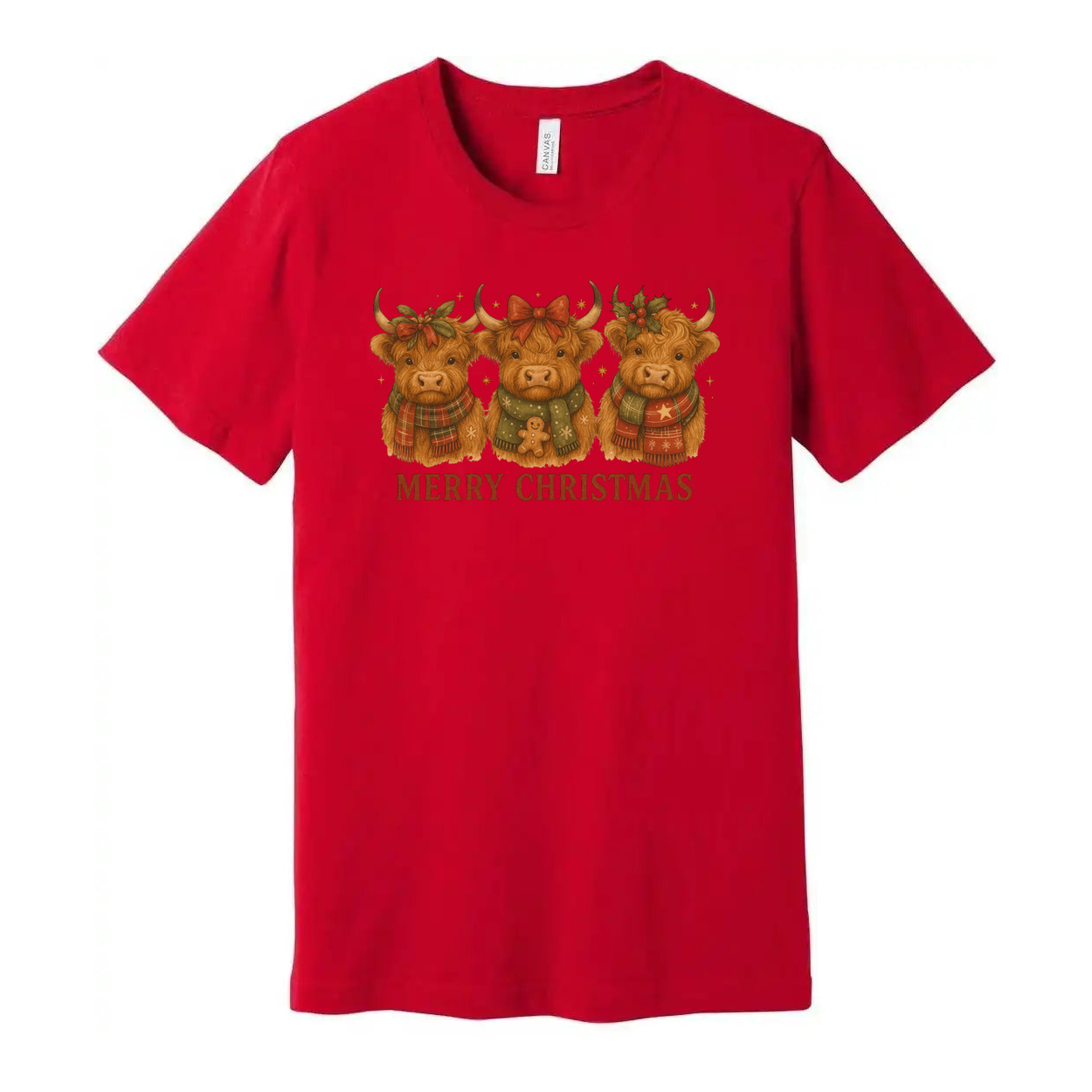 Unisex Christmas T Shirt With Three Highland Cows In Holiday Scarves And Merry Christmas Message