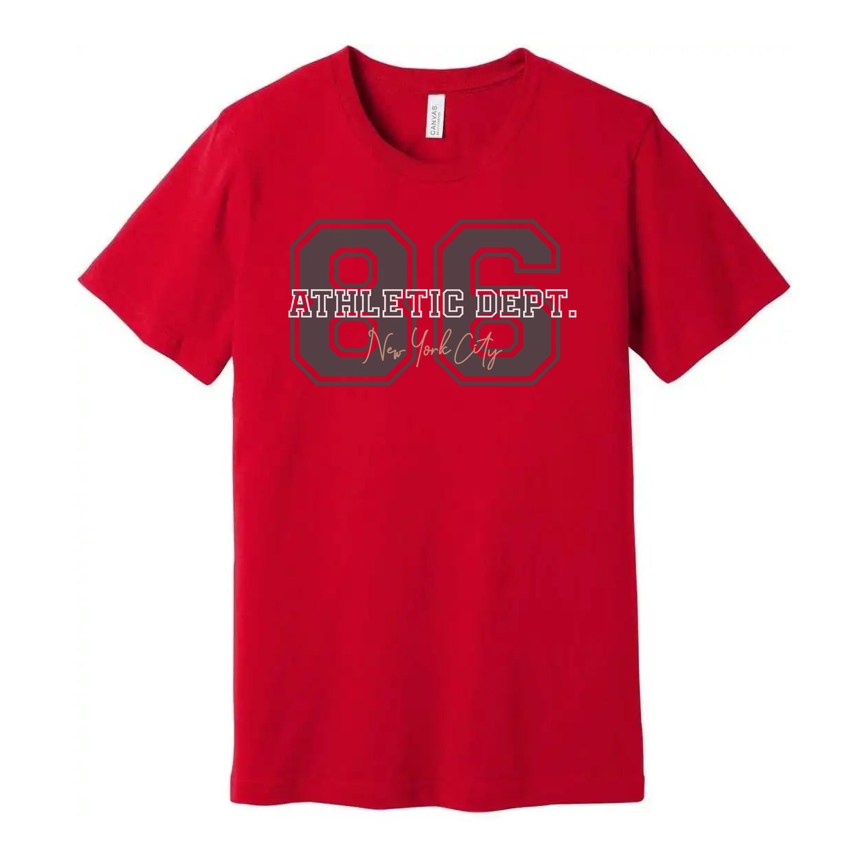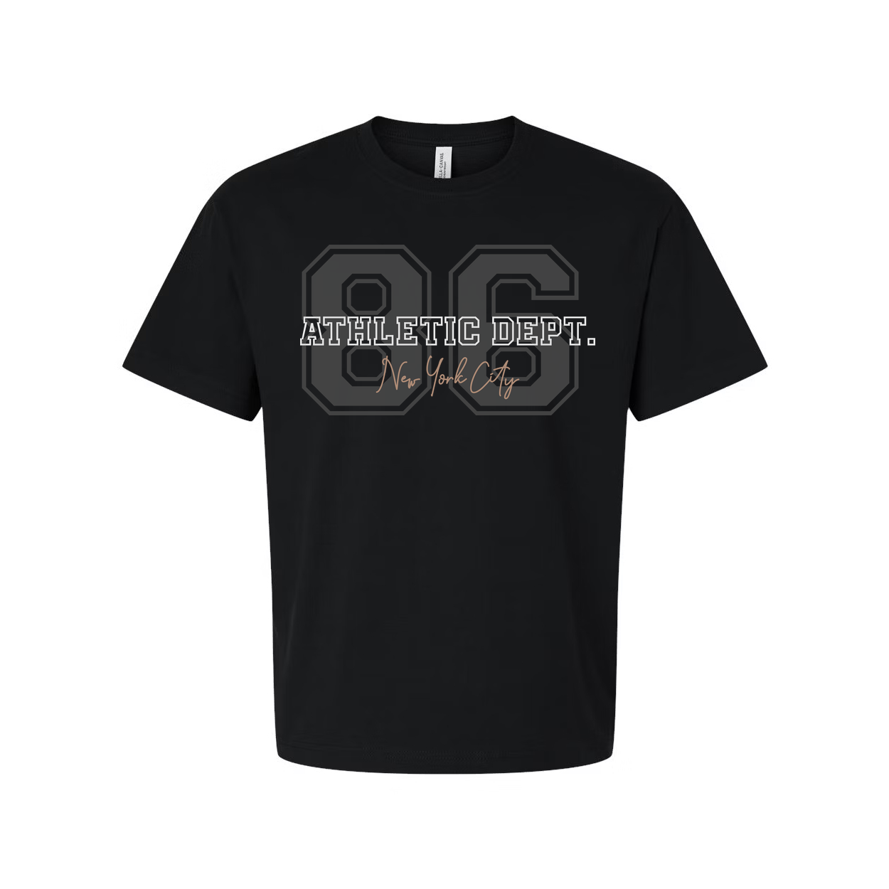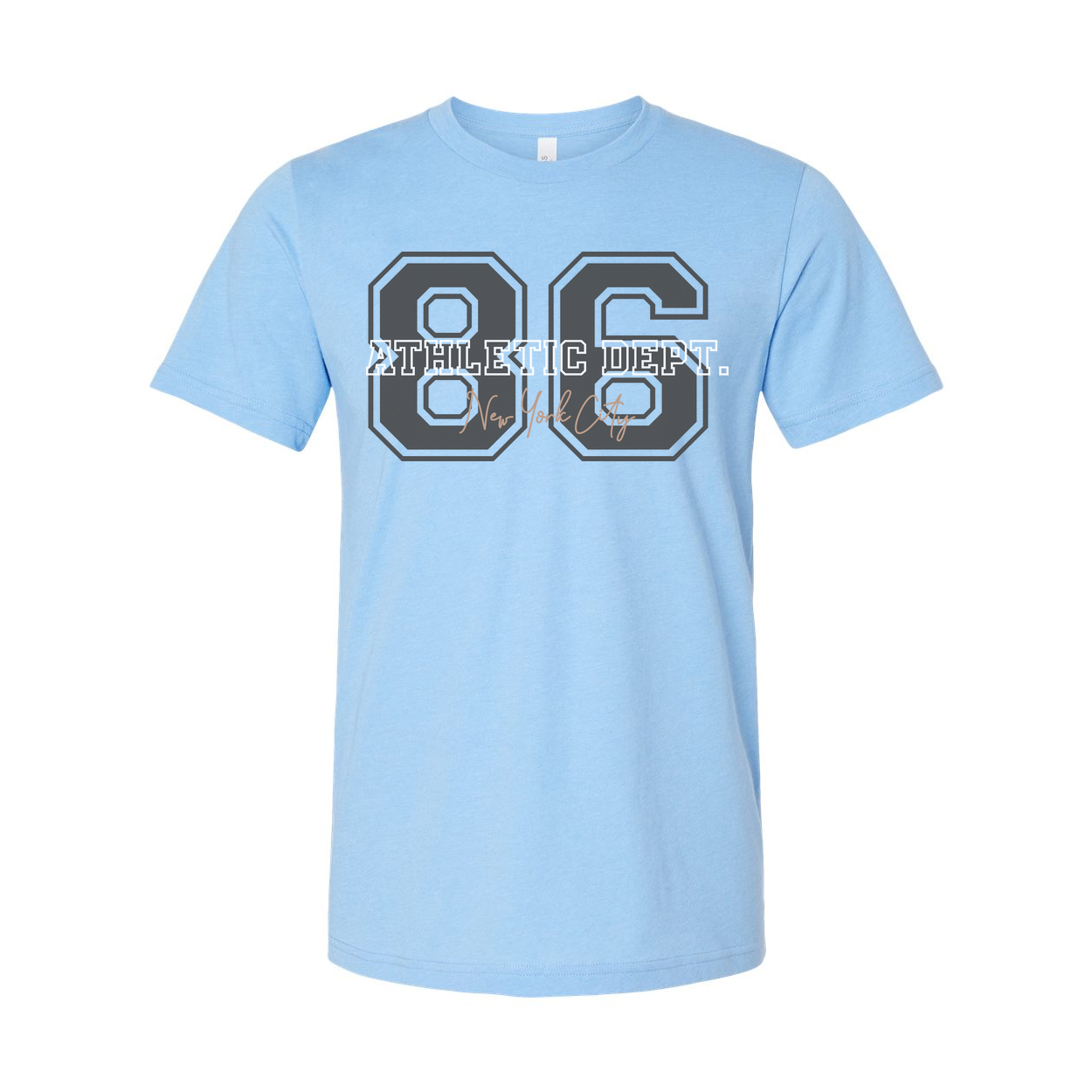 Unisex Graphic T Shirt With Large 86 Varsity Digit Number And Athletic Dept Print