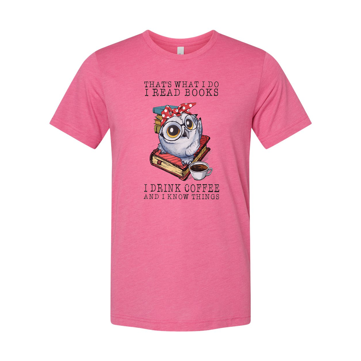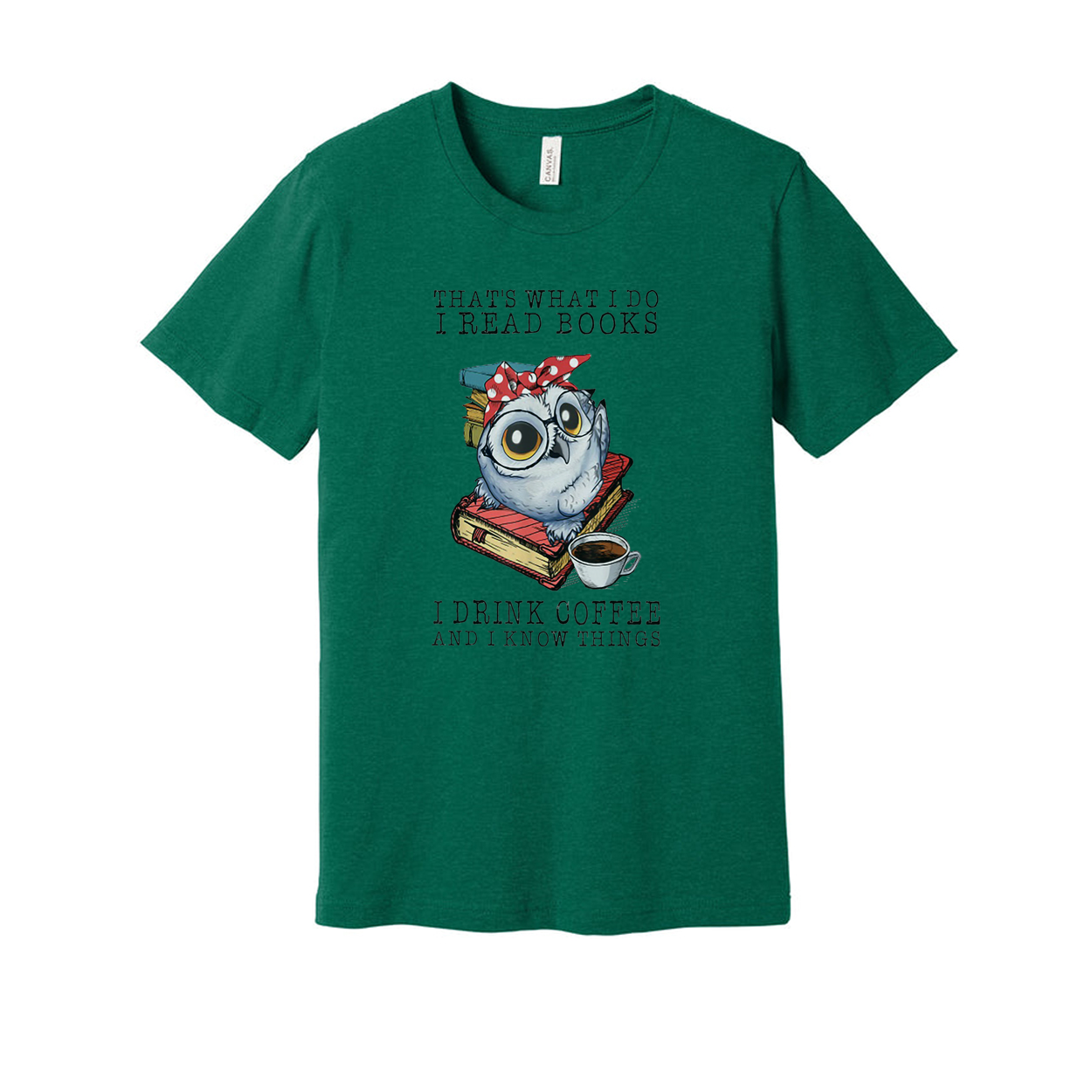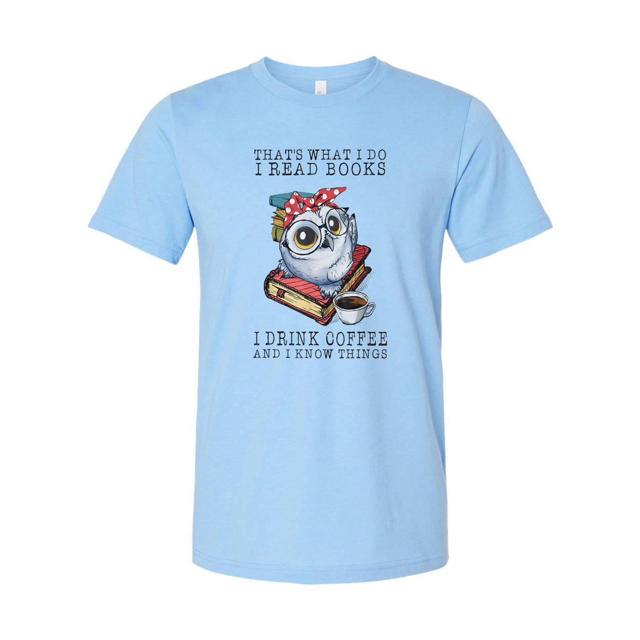 Unisex Graphic Tee With Owl Reading Books And Coffee Quote Design For Book Lovers