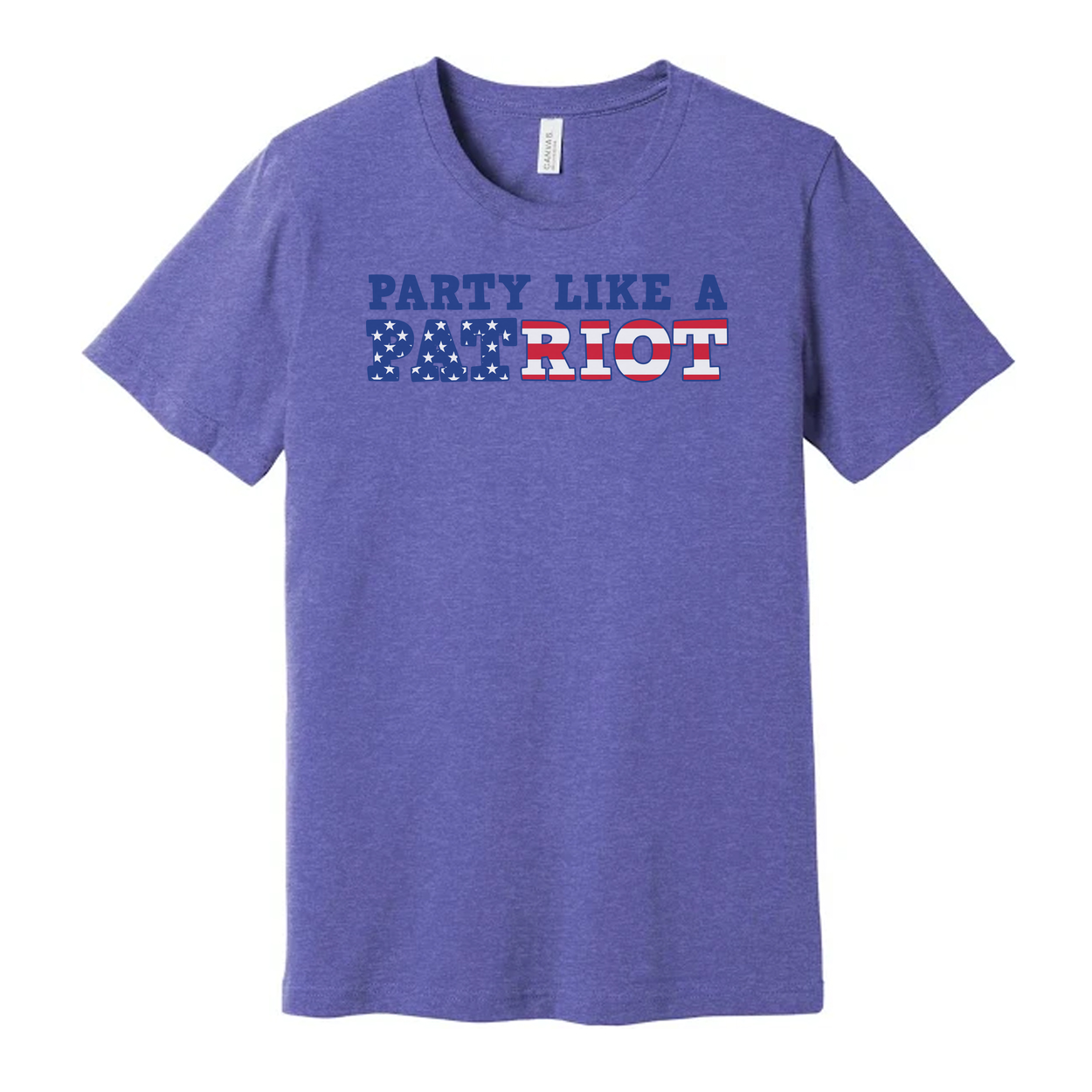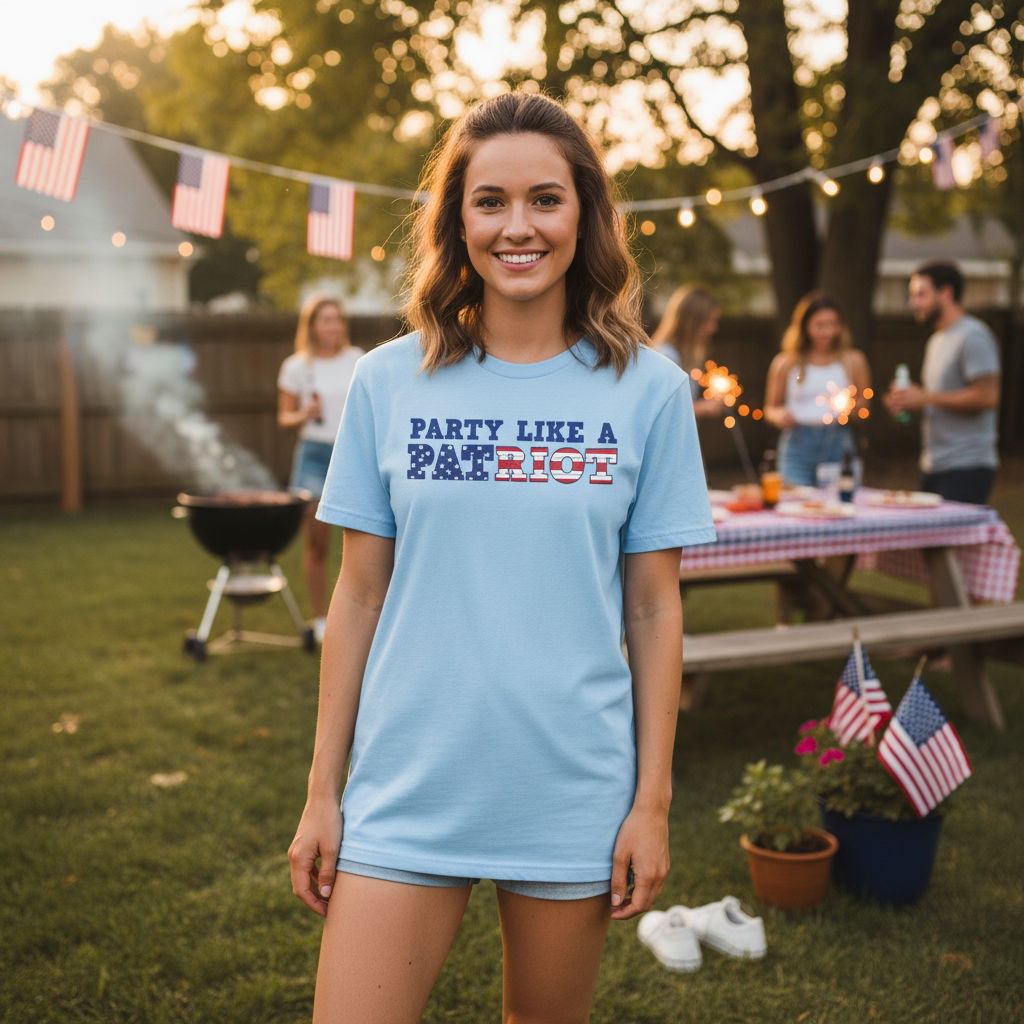 Unisex Short Sleeve Graphic Tee Featuring Party Like A Patriot With Stars And Stripes Lettering