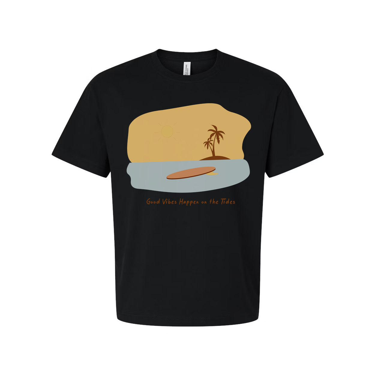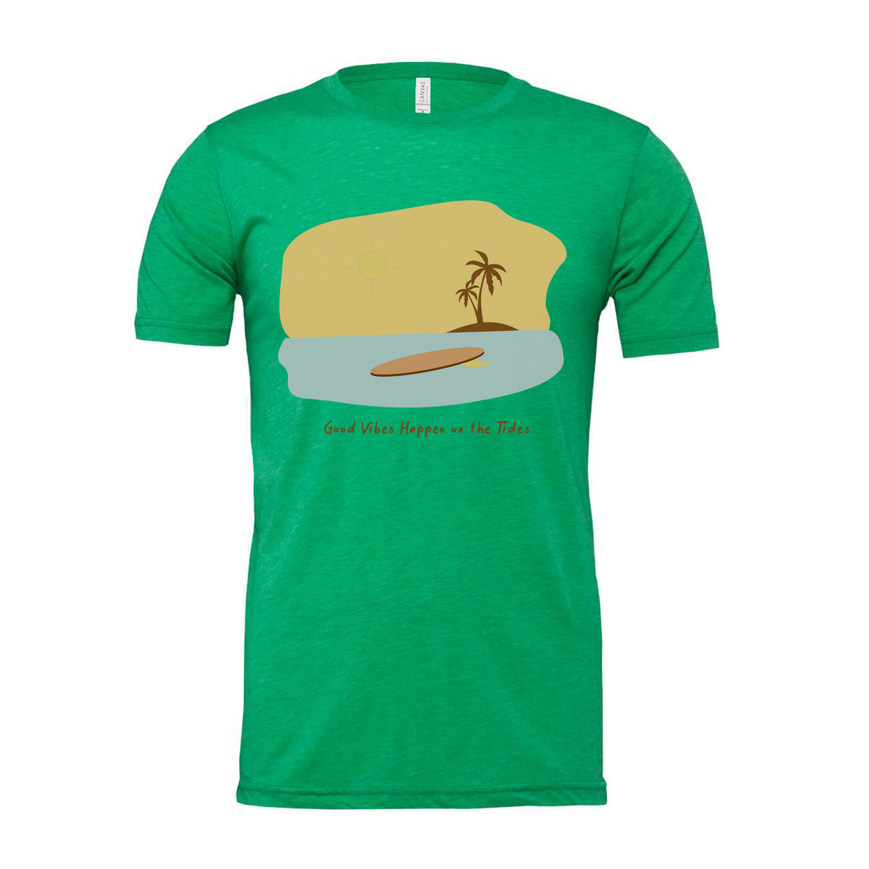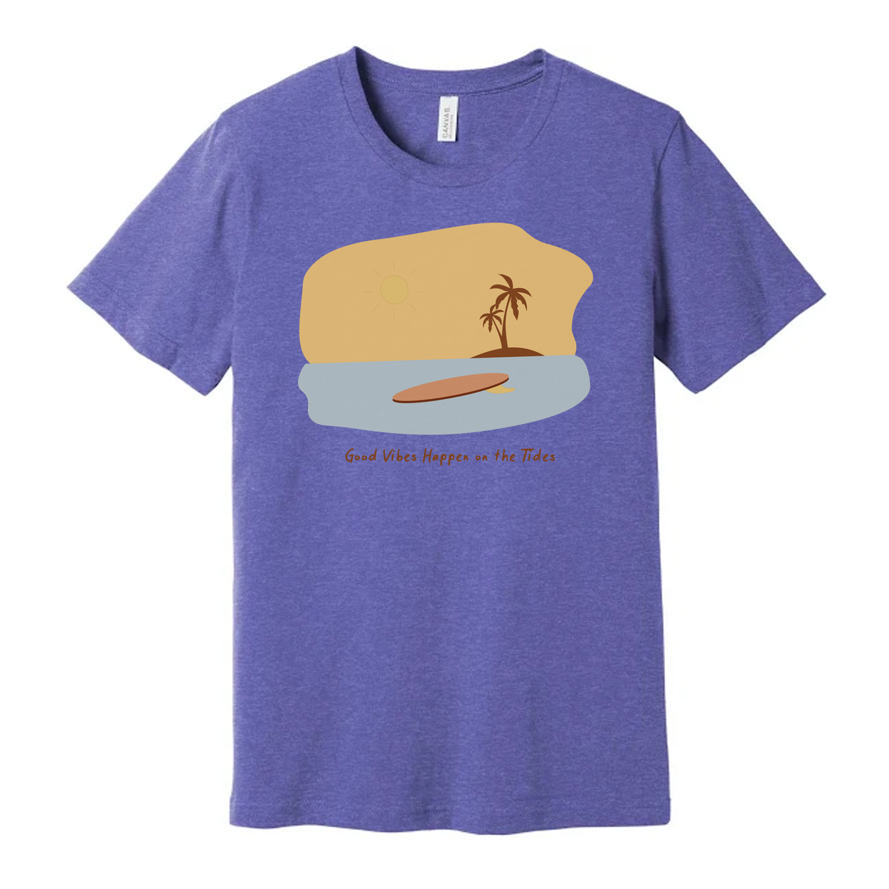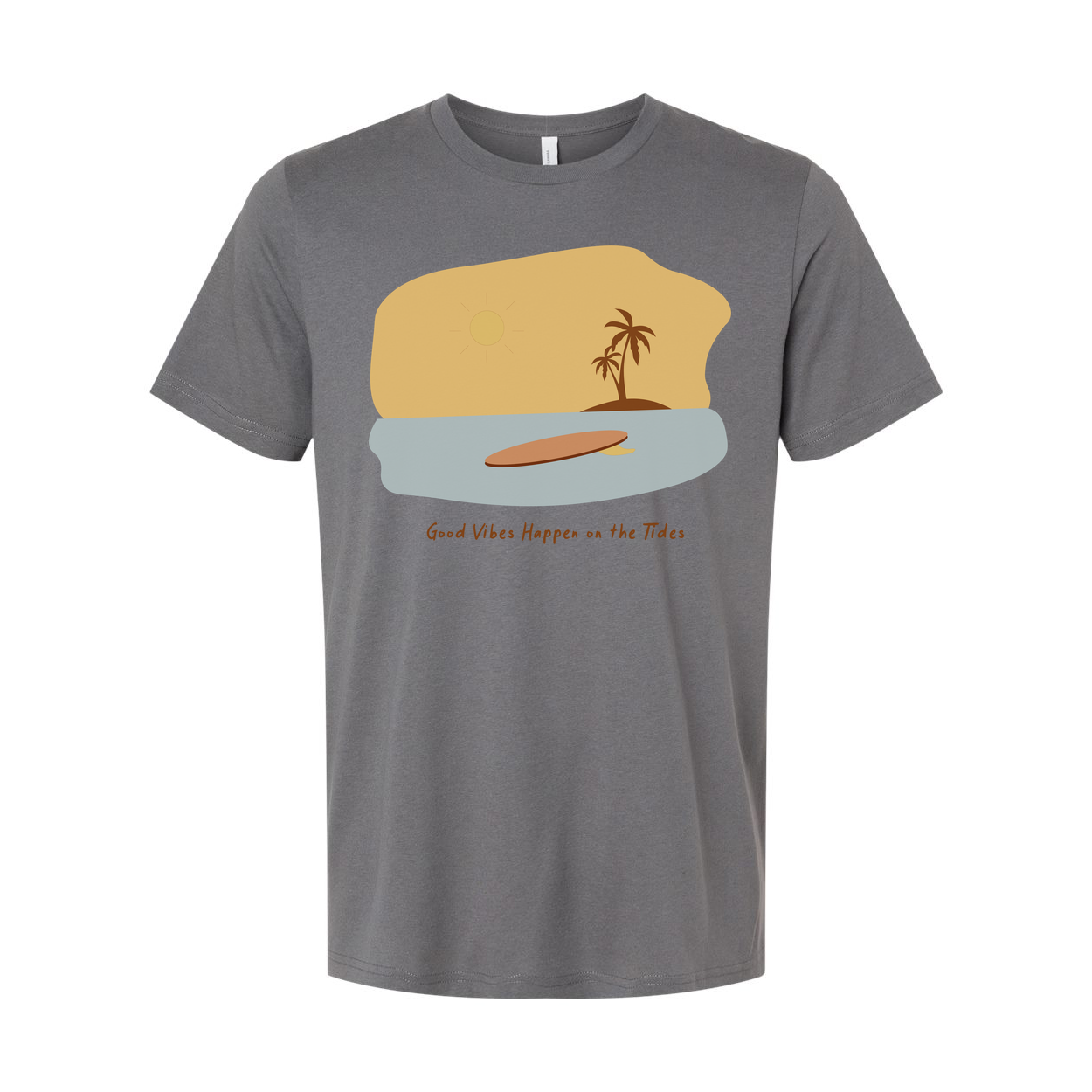 Unisex Surfing Graphic T Shirt With Surfboard Sunset Beach Scene And Palm Tree Artwork