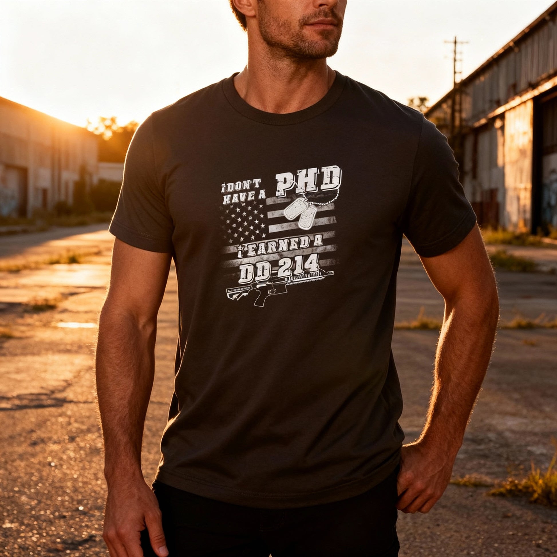 Unisex Veteran T Shirt Dont Have A PhD Earned A DD 214 Graphic With American Flag And Rifle