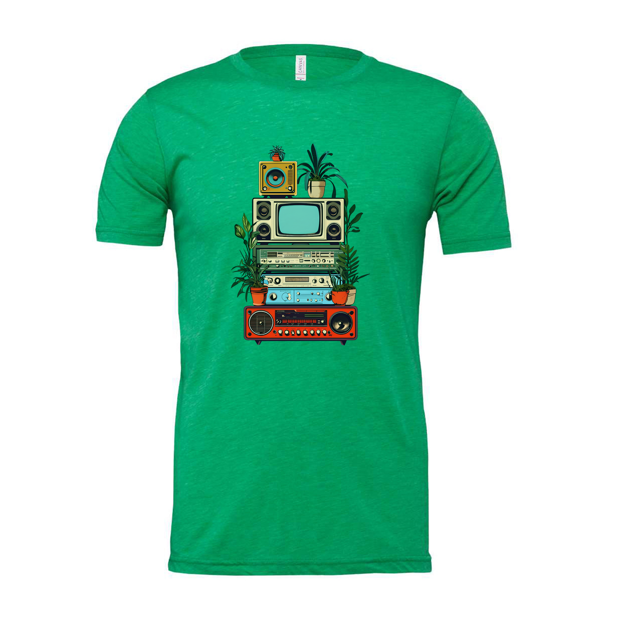 The design features a vivid, multi‑color illustration of stacked vintage electronics intertwined with green plants, creating a playful yet grounded look on a crisp white background. The graphic offers a generous, eye‑catching focal point that pairs well with denim or joggers for a laid‑back, retro vibe. The unisex fit provides a relaxed silhouette that suits a wide range of body types for comfortable all‑day wear.